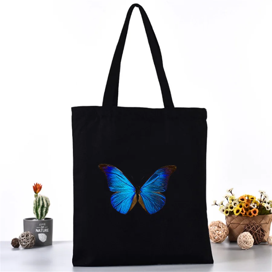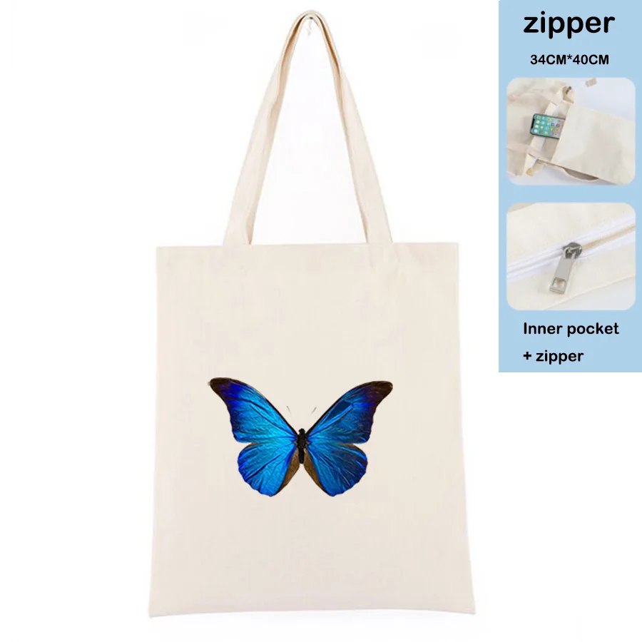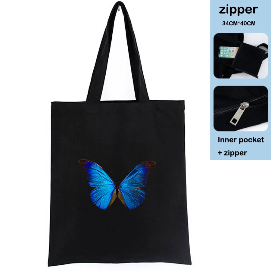 Корейская черная сумка для покупок с синей бабочкой, хлопковые винтажные женские ручные сумки, кавайная белая холщовая Сумка-тоут через плечо, сумка для покупок на молнии