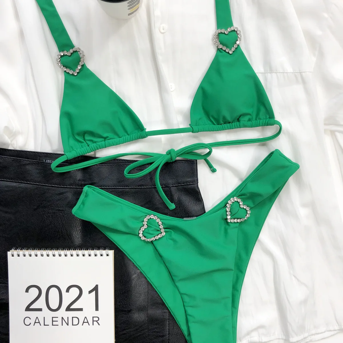 Бикини пуш-ап женское однотонное зеленое в форме сердца с кристаллами