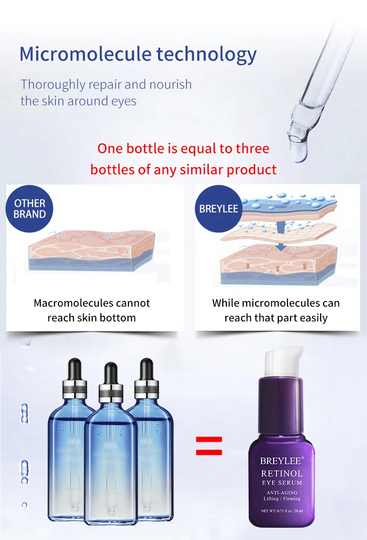 Тщательно восстанавливает и питает кожу вокруг глазОдна бутылка равна трем бутылкам любого аналогичного продуктаДругой брендМакромолекулы не доходят до нижней части кожиВ то время как микромолекулы могут легко достичь этой части