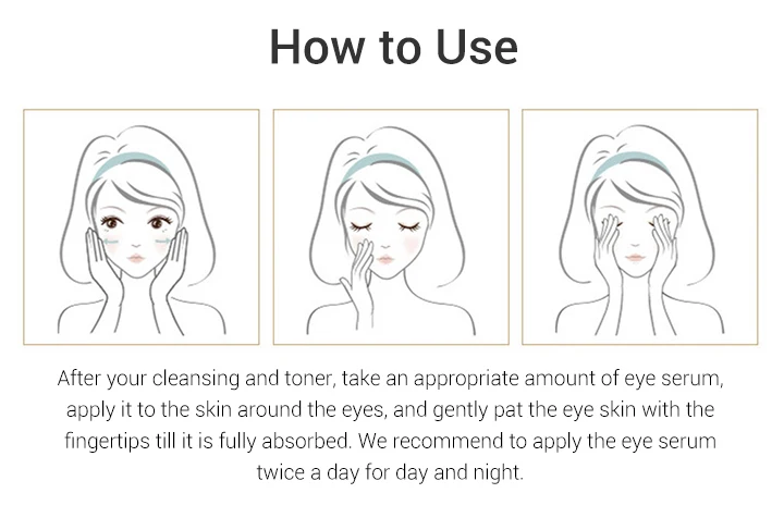 После очищения и нанесения тонера Возьмите соответствующее количество сыворотки для глаз, нанесите ее на кожу вокруг глаз и аккуратно погладьте кожу глаз кончиками пальцев до полного впитывания. Рекомендуется применять сыворотку для глаз два раза в день в течение дня и ночи.