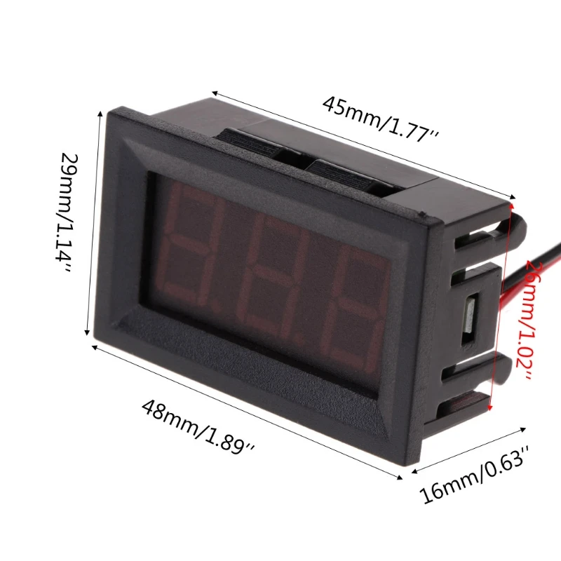 Цифровой вольтметр 4,5 в-30 В постоянного тока, 0,56 дюйма, светодиодный 2-проводной вольтметр с измерителем напряжения и панельюOOTDTYОписание:-Эта проводка вольтметра проста, ей нужно всего лишь подключить два провода, красный провод подключен к положительному полюсу, черный провод подключен к отрицательному полюсу.-Есть защита, когда провода подключены неправильно, электрическая цепь не будет забита.-Этот вольтметр не нуждается в рабочей мощности внешнего привода, он может работать с измерением напряжения, диапазон рабочего напряжения составляет 4,5-30 в.-Для достижения наилучшей точности измерения этот вольтметр автоматически перемещает десятичную точку в соответствии с различным измеряемым напряжением. Когда он измеряет напряжение ниже 10 В, он будет отображать два знака после запятой. Когда он измеряет напряжение выше 10 В, он будет отображать одно место после десятичной точки.-Этот вольтметр можно использовать для измерения напряжения аккумуляторной батареи в мотоциклах и автомобилях, а также для определения состояния аккумуляторной батареи. Его также можно использовать для измерения других напряжений.Характеристики:Диапазон измерения: 4,5-30 вДопустимая погрешность: от 0,01 в до 10 в, от 0,1 в до 10 В, допустимая погрешность 1% (+/-1 слова)Режим отображения: 3-значная светодиодная цифровая трубка 0,56''Цвет дисплея: красный/зеленый/синий (опционально)Частота обновления: около 200 мс/разИсточник питания: не требуетсяПотребление тока: менее 20 мА, обычно 5-15 мАРабочая температура: -10 °C ~ 65 °CРазмеры: 48x29x16 мм/1,89x1,14x0,63 дюймаРазмер отверстия: 46x27 мм/1,81x1,06 дюймаДлина вывода: 20 см/7,9 дюймаМеры предосторожности:30 В-это максимальное рабочее ограниченное напряжение вольтметра, пожалуйста, оставьте достаточный запас при работе, чтобы избежать постоянного повреждения вольтметра из-за электрической искры, пульсации источника питания, или другое слишком высокое резкое изменение напряжения.ПосылкаЦифровой вольтметр, 1 шт.