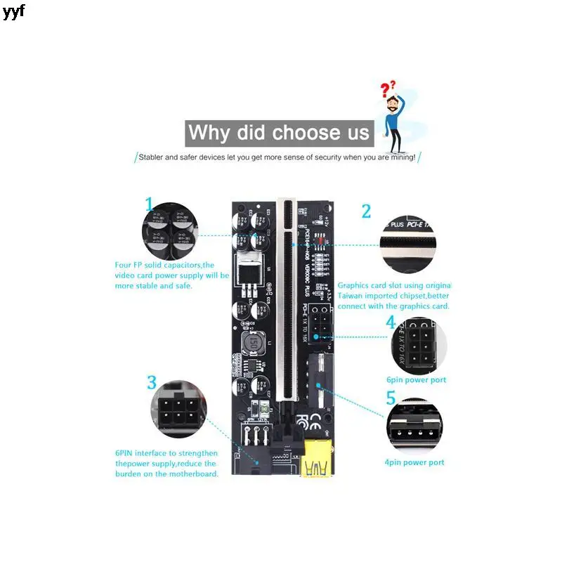 2: карта адаптера имеет 6-контактный интерфейс и Усовершенствованный DC-DC 12 В для увеличения источника питания, так что блок питания видеокарты не зависит от материнской платы, тем самым уменьшая нагрузку на материнскую плату при подключении нескольких графических карт.