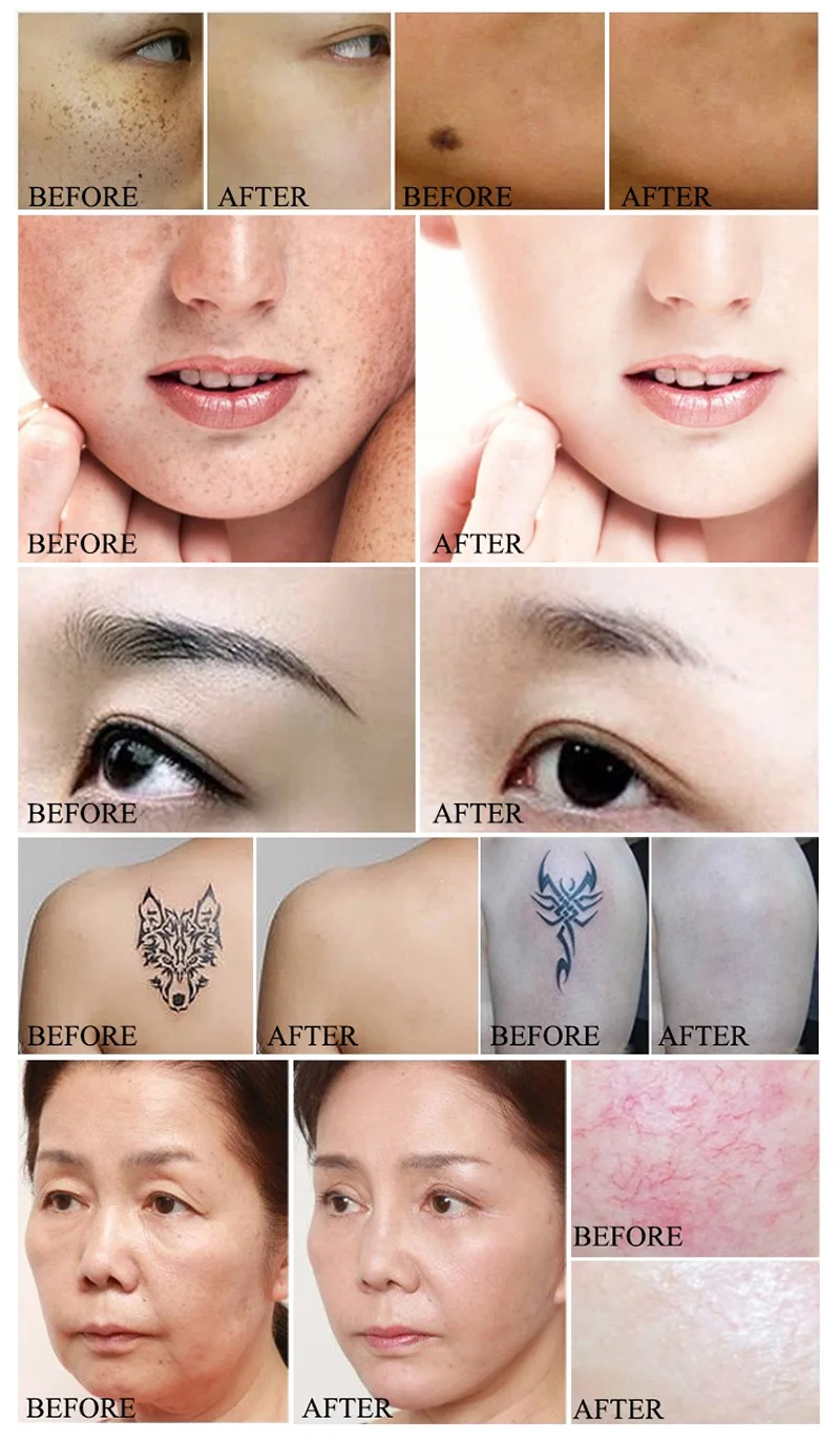 * Депиляция: постоянное удаление волос, непристойные волосы по всему телу (волосы во время вегетации), включая более светлые волосы * веснушки: удаление веснушек, хлоазма, солнечные ожоги, возрастные пятна, геморрой, БОРОДАВКИ для лица. * Омоложение: улучшает расширенные поры, огрубевшую кожу, мелкие морщины и восстанавливает эластичность кожи. * Морщины: удаляет реально, Против ложных морщин, против старения лица и тела. * Лечение телангиэктазии: красная кровь, смывание лица * Улучшает тусклость, делает кожу красивой и ровной. * Специально удаляет красные, коричневые, коричневые и другие цвета татуировок. * Эффективно удаляет все брови, вышитые брови, губы, татуировки, * Лечение пигментированных повреждений кожи и смешанной пигментации, таких как пигментные пятна, родинки, ОТА, черные Клещи и т. Д.