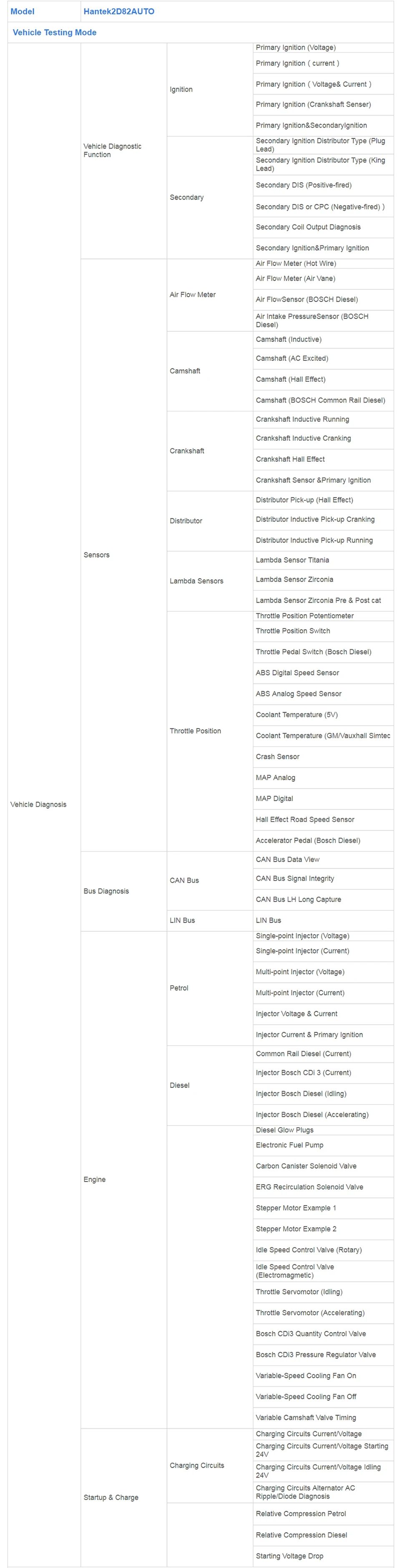 Первые тестовые проекты: вакуумная степень впускного коллектора и зажигание, клапан регулировки лампана вакуумная степень и зажигание, зажигание выхлопа (холостого хода), зажигание выхлопа (запуск).Запуск и зарядка: цепь зарядки, ток и напряжение.Привод: бензин/дизель.Обнаружение шины: наблюдение за данными CAN Bus, целостность сигнала CAN bus, долгосрочное приобретение CAN bus LH, LIN bus.Датчик s: расходомер воздуха, распределительный вал, коленчатый вал, распределитель, датчик лямбда, положение дроссельной заслонки.Зажигание: Первичное/вторичное.Осциллограф: 2 канала осциллографа, 80 МГц полоса пропускания, 250 м частота дискретизации.Универсальная функция мультиметра: напряжение, ток, сопротивление, диод, конденсатор, испытание ВКЛ-ВЫКЛ;Функция выходного сигнала генератора сигналов: синус выхода, квадрат, треугольник, трапециевидный и другие формы волны; Синус до 25 МГц;