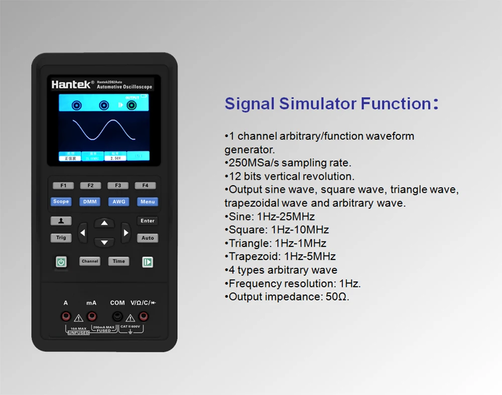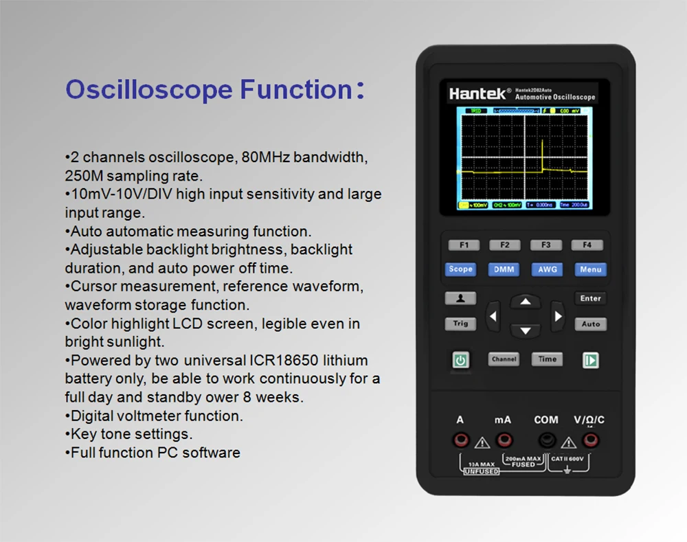 Совершенно новая портативная серия oscilloscope-Hantek2000, она продолжает компактную и легкую концепцию, но с многофункциональным тестером 4 в 1 нового поколения: Автомобильная диагностика, осциллограф, источник сигнала и мультиметр; небольшой объем некоммерческого захвата одной рукой; Подвесная подставка была разработана для поддержки регулировки нескольких углов; Ультра-низкая мощность, Интерфейс зарядки типа C, каждый 2 часа заряда батареи позволяет работать один полный день или в режиме ожидания два месяца; Цветной ЖК-дисплей высокой четкости четкий и деликатный; Минималистичный дизайн клавиатуры упрощает работу, прост в использовании.