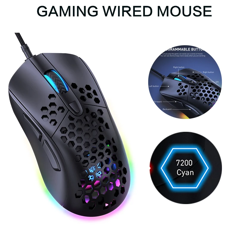 RGB светильник мышь компьютерная Проводная программируемая, 7200 точекдюйм, 7 кнопок