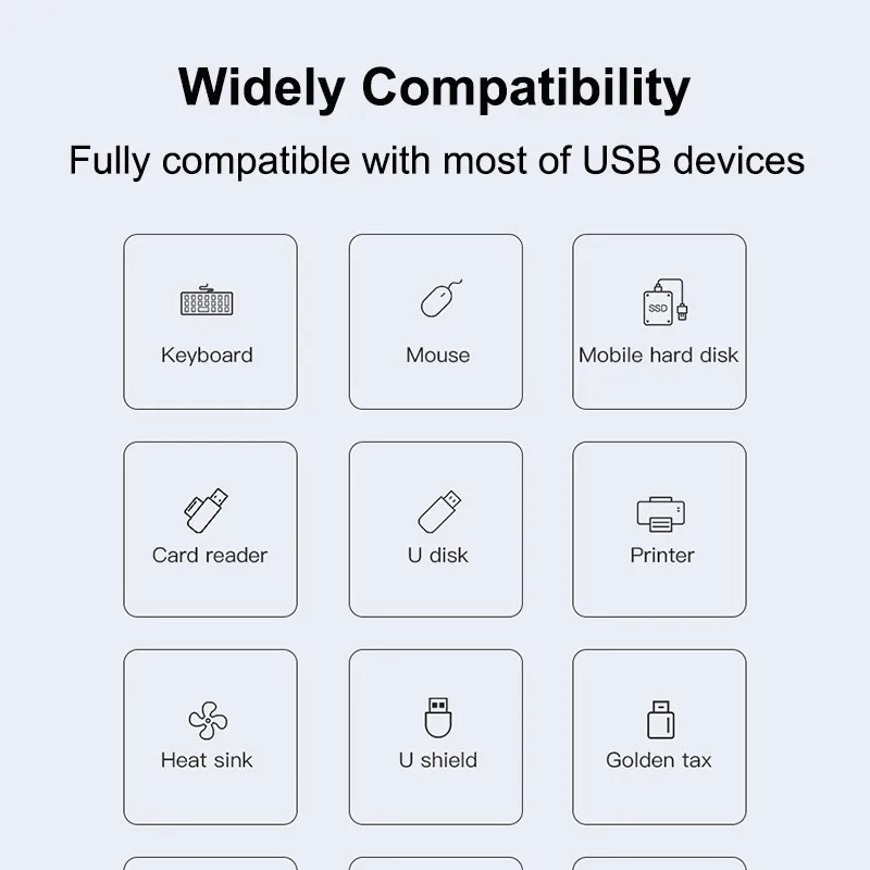 Универсальная совместимость: полностью совместим с большинством USB-устройств, клавиатуры, мыши, u-диска, камеры, usb-гарнитуры, принтера, usb-кабеля, микрофона, игровых автоматов, usb-вентилятора, компьютера, ноутбук и т. Д.