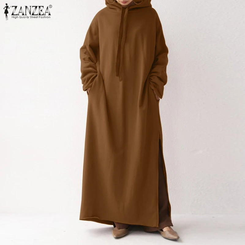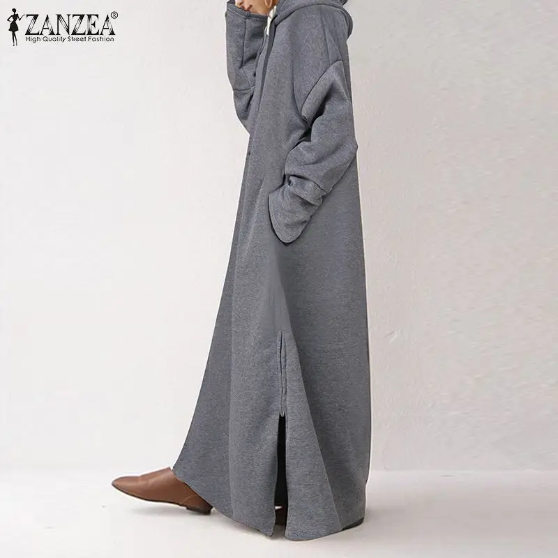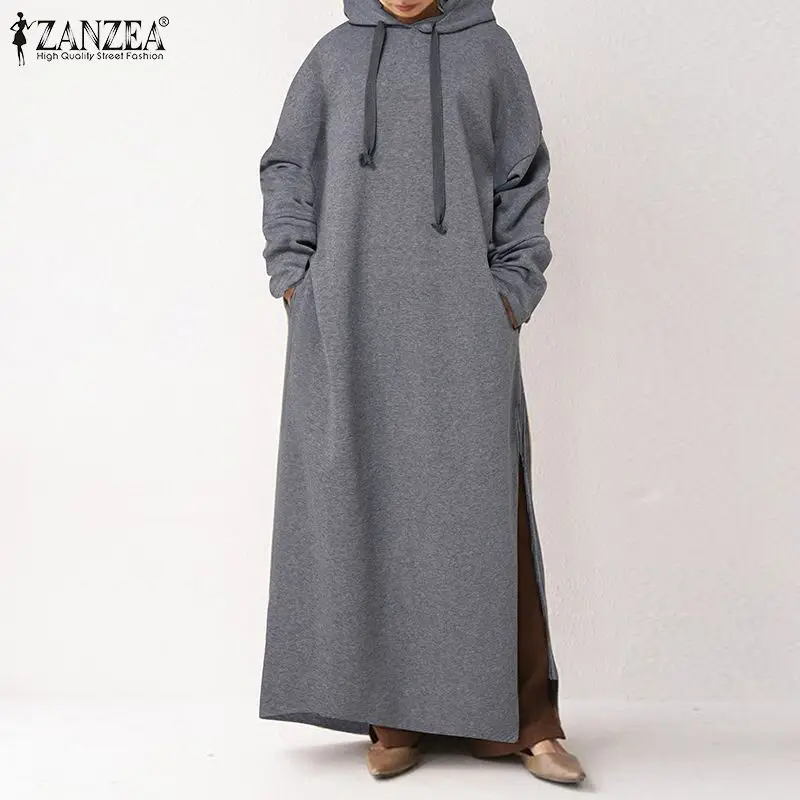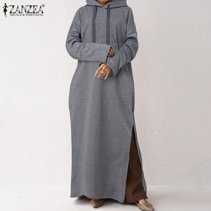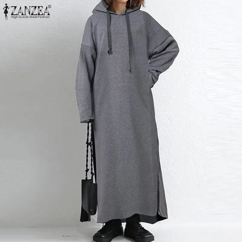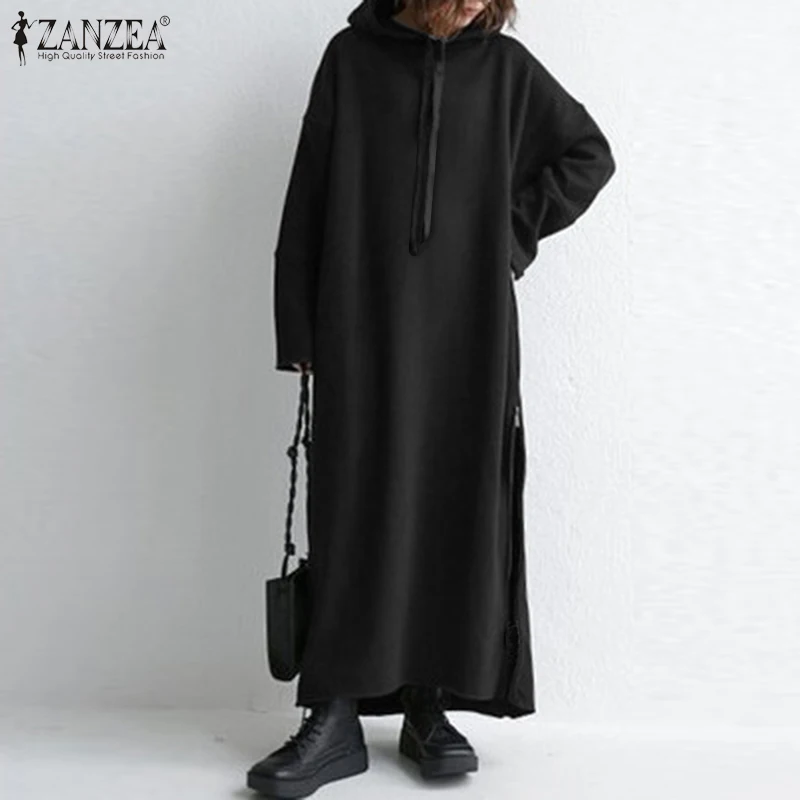 Осень 2021, толстовки ZANZEA с длинным рукавом, свитшоты, платье, Женский пуловер, повседневное длинное платье оверсайз с Боковым Разрезом, женское платье