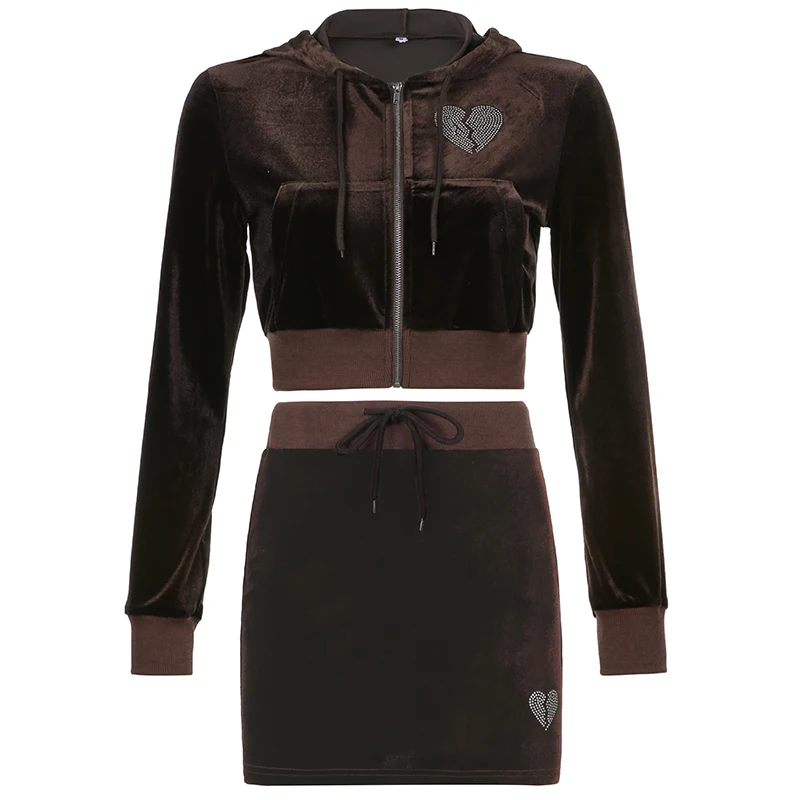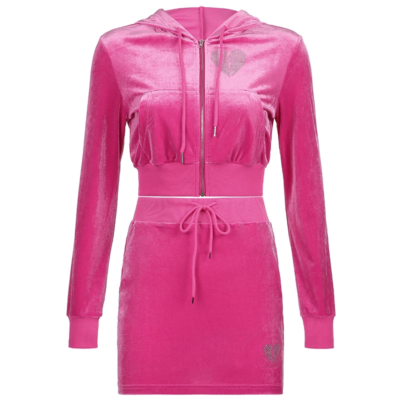 Милые Бархатные костюмы Y2K с юбкой, куртки с капюшоном, милые толстовки со стразами и сердечками, на молнии, с длинным рукавом, укороченные свитшоты, костюмы