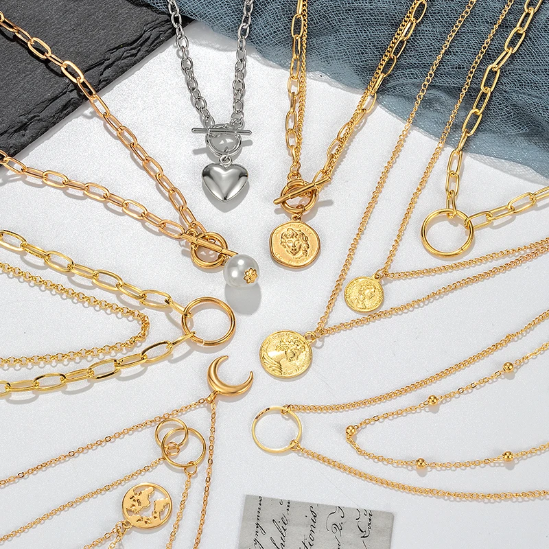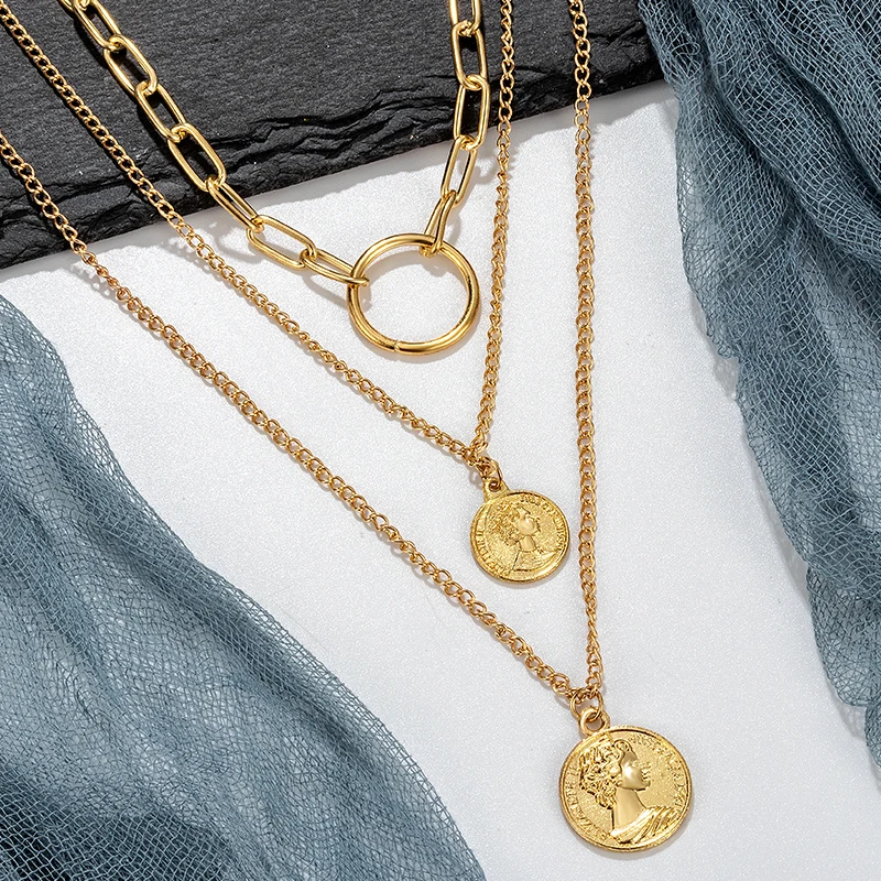 Женская многослойная цепочка на шею, винтажное толстое ожерелье золотого и серебряного цвета с жемчужными монетами, кольцо с подвеской, чокер, трендовая бижутерия 2021