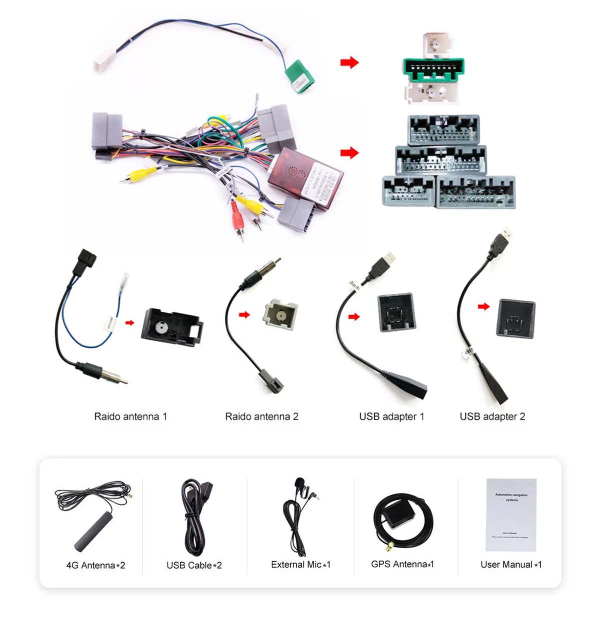 Примечание: Для приятного головного блока, Не поддерживайте, как показано ниже: iPod, Оригинальная Автомобильная GPS антенна, оригинальная автомобильная задняя камера, оригинальный автомобильный bluetooth, оригинальный автомобильный USB, а также оригинальный автомобильный микрофон.
