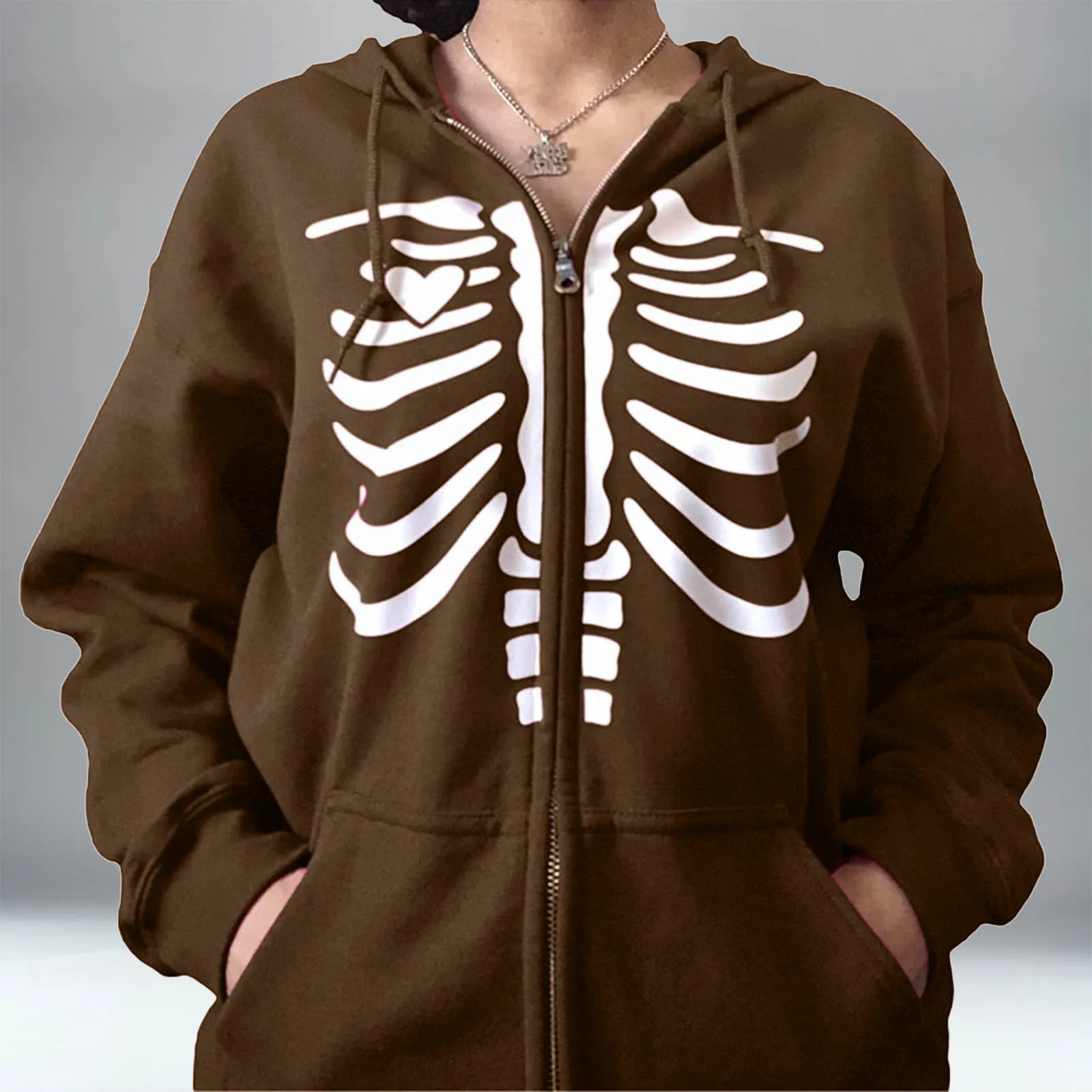 Женская толстовка с принтом скелета, на молнии, с длинным рукавом