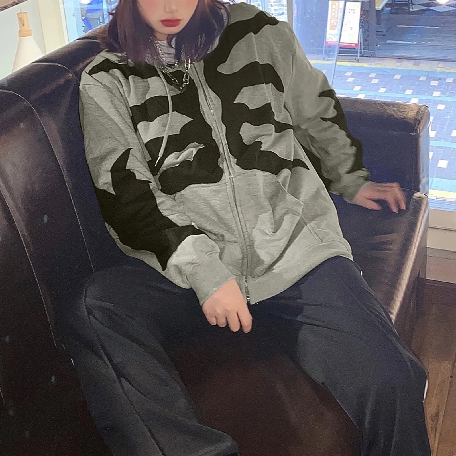 Толстовка Y2K в стиле Харадзюку со скелетом на молнии, Мужская толс...