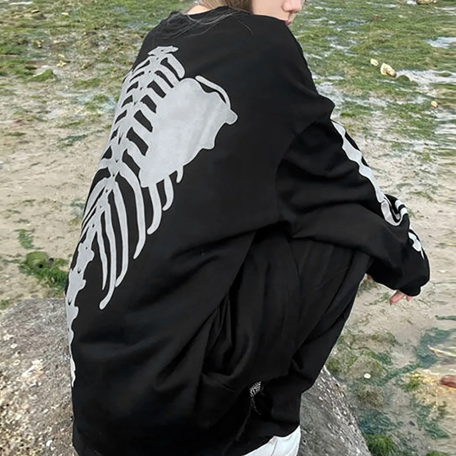Свободная Толстовка Y2K в Корейском стиле Харадзюку со скелетом и м...