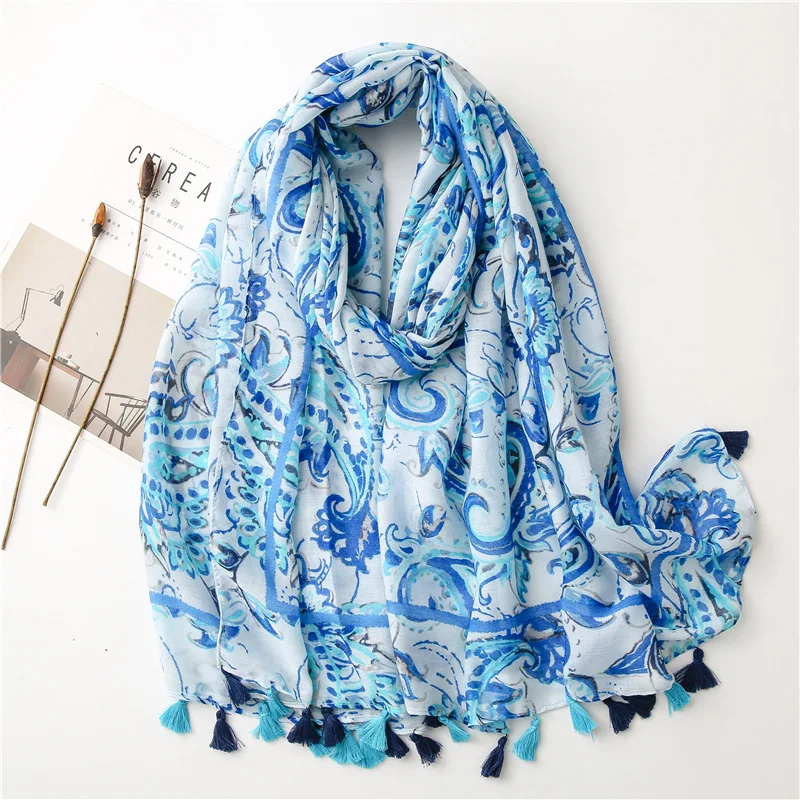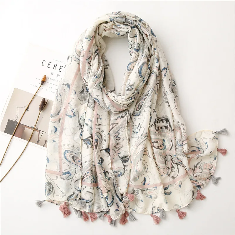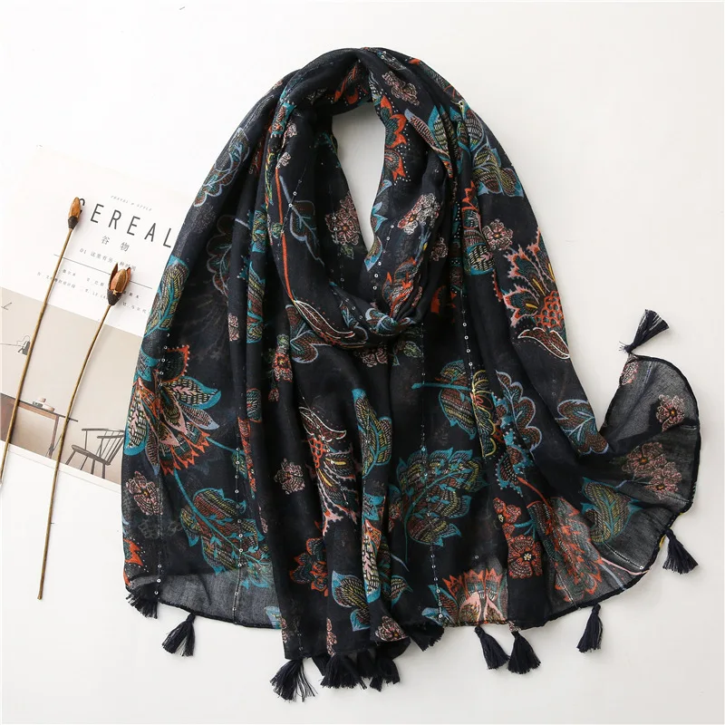 Женская зимняя шаль из вискозы, с цветочным принтом и кисточками