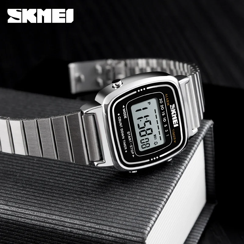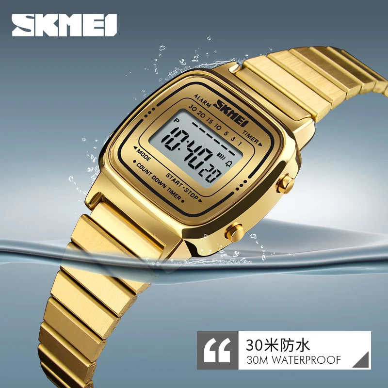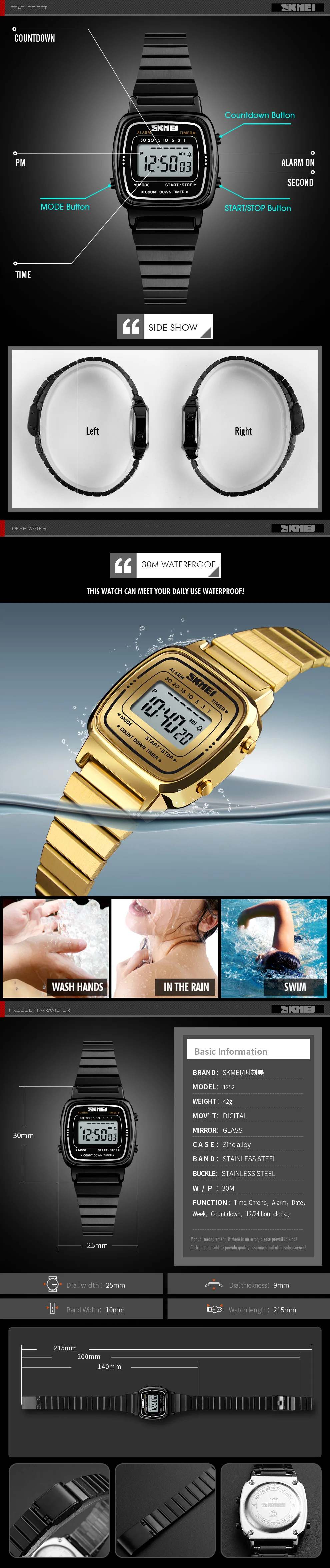 Бренд: SKMEIПол: женские часыСтиль: модный и Повседневный, СпортивныйМатериал корпуса: сплавМатериал ремешка: нержавеющая стальЦиферблат Диаметр: 25 мм/0,98 вЧехол Толщина: 9 мм/0,35 вГруппа Ширина/педикюра задняя часть: около 10 мм/0,39 вДлина ремешка: 215 мм/8,46 дюйма (максимальный Периметр: 200 мм/7,87 дюйма)Функции: Водонепроницаемость 3 бар, хронограф, дата, месяц, обратный отсчетГлубина водонепроницаемости до 30 м (пожалуйста, не нажимайте кнопки под водой)
