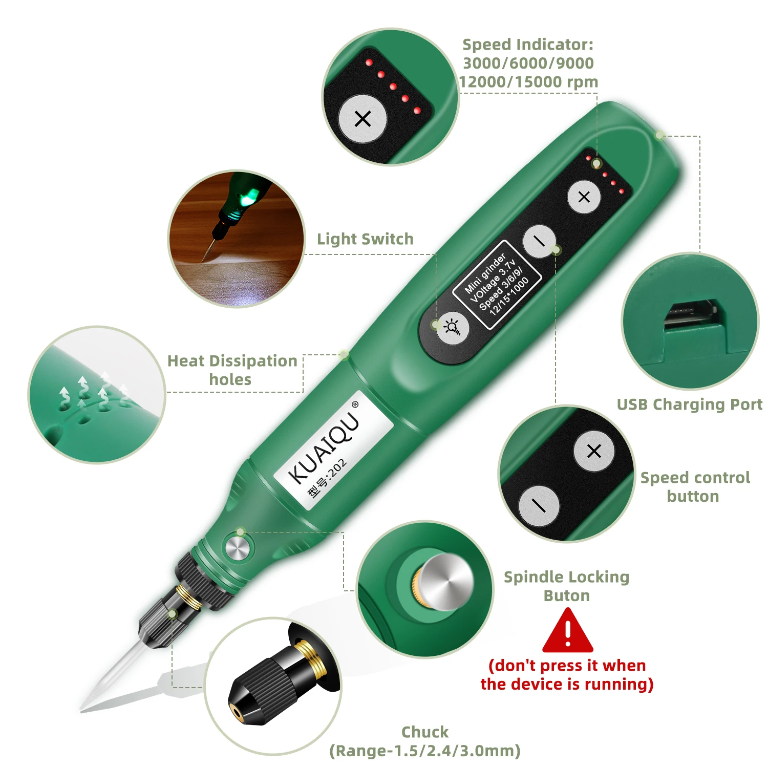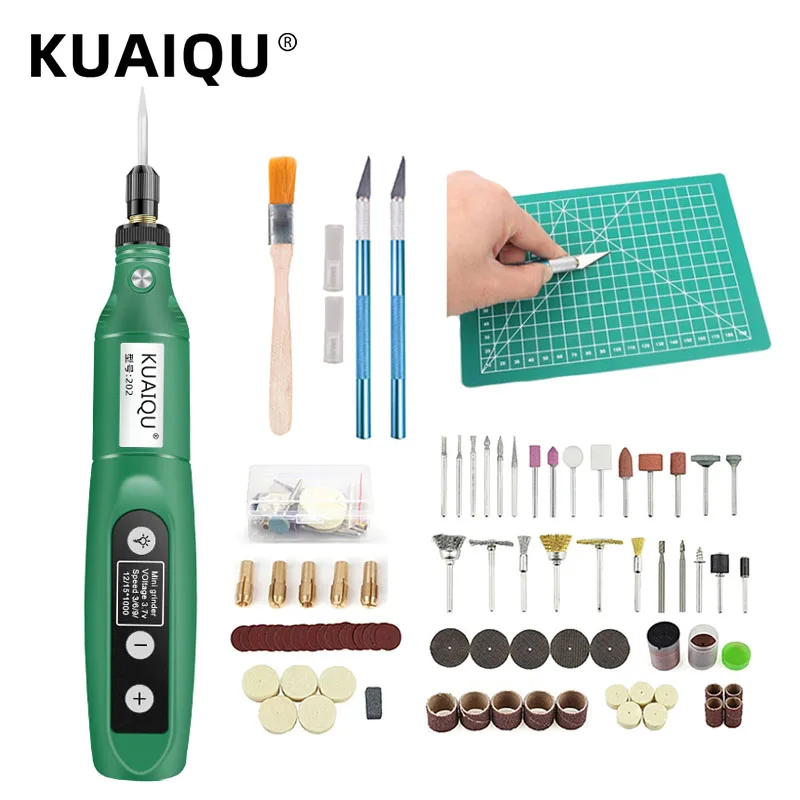 Тип Название: 5-ступенчатая-дрельБатарея: литиевая батареяВремя зарядки: 2 часаНапряжение зарядки: 5 В постоянного тока (USB)Собирать зажимы Диаметр: 0,5-3,2 ммСкорость: 3000/6000/9000/12000/15000 об/минEngravingOutput Напряжение: 3,7 VНоминальная входная мощность: 10 ВтНоминальное напряжение: 110 В ~ 220 ВОсобенности:1. Светодиодный рабочий светильник2. Скорость регулирования-этот Электрический инструмент для резьбы имеет 5 регулировок скорости, диапазон регулировки скорости: 3000-15000 об/мин.3. Полные аксессуары-оснащены 24 аксессуарами для бурения, все готово и завершено.4. Идеальная шлифовальная машина-идеальная электрическая шлифовальная машина для резки, гравировки, фрезерования, шлифования, полировки, удаления и сверления. Набор гравировки шлифовальной машины необходим для самостоятельной резьбы и шлифования.5. Подходит для Нефритового агата, ядерной резьбы, резьбы по дереву, шлифовки алюминиевой пластины, тонкой медной доски, пластиковой доски, ДСП, печатной платы, эпоксидной доски.6. Прочный и надежный-небольшого объема, светильник вес, легко взять с собой, удобная рукоятка из биметаллического, лучше контролировать предлагает при бурении, удобно в использовании.Для безопасного использования:1. Когда вы закончите использование устройства, выключите двигатель и убедитесь, что все движущиеся части полностью остановились.2. Прежде чем использовать дополнительные аксессуары, не включенные в этот набор, всегда сравнивайте максимально допустимые RPM этого конкретного аксессуара с RPM этого инструмента.3. В чехол o электрические или механические неисправности, немедленно выключите инструмент.4. Не активируйте переключатель при смене аксессуаров.5. Никогда не используйте замок вала, когда плата работает.6. Убедитесь, что размер цанги соответствует размеру вала аксессуара.7. Храните инструмент в местах, где температура не будет превышать 50 градусов Цельсия.