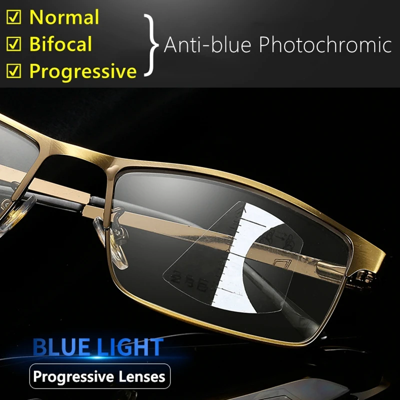 Мультифокальные очки для чтения, фотохромные, с защитой от синего света, в металлической оправе, бифокальные, пресбиопические очки для мужчин и женщин