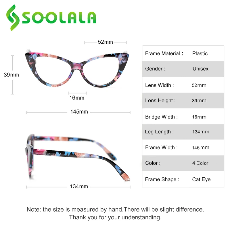 -Ширина линз: 52 мм/2,05 дюйма, высота: 39 мм/1,54 дюйма, мост: 16 мм/0,63 дюйма, длина дужки: 132 мм/5,20 дюйма, общая длина: 145 мм/5,71 дюйма