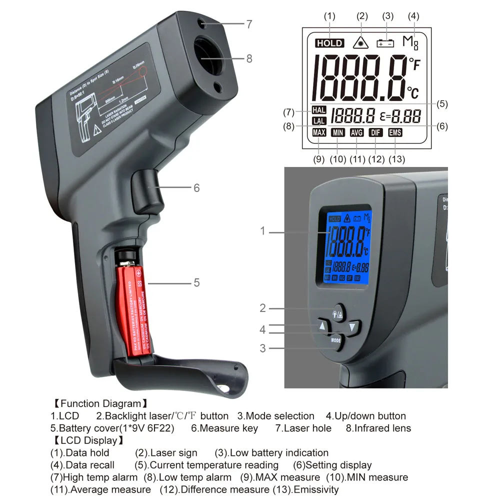Это своего рода качественный инфракрасный термометр, ЖК-дисплей с подсветкой, вы можете видеть данные измерений четко, прост в использовании даже при плохом освещении. Простое управление одной рукой, подходит практически для всех возрастов. 5 видов на выбор, KM-IT550AT, KM-IT750AT, KM-IT1100AT, KM-IT1300AT, KM-IT1600AT, вы можете выбрать в соответствии с вашими требованиями. Вы можете попробовать. Особенности: Две лазерные линии для точной цели, чтобы улучшить точность измерений. ЖК-дисплей с подсветкой, вы можете видеть данные измерений четко, легко использовать даже при плохом освещении. Простое управление одной рукой, подходит практически для всех возрастов. 5 видов на выбор, KM-IT550AT, KM-IT750AT, KM-IT1100AT, KM-IT1300AT, KM-IT1600AT, вы можете выбрать в соответствии с вашими требованиями. Конструкция преобразования температуры ℃ и ℉, вы можете легко настроить его в соответствии с вашими привычками использования. С индикацией низкого заряда батареи, удержанием данных, функцией автоматического отключения. Поддержка высокотемпературной сигнализации (HAL), низкотемпературной сигнализации (LAL), максимальное измерение значения, измерение минимального значения, измерение среднего значения (AVG), Функция измерения d-значения (DIF). Примечание: Термометр не может измерять внутреннюю температуру объекта. Не подходит для измерения температуры поверхности тела, например температуры лба. Характеристики: Название: инфракрасный термометр Материал: пластик Тип: KM-IT550AT, KM-IT750AT, KM-IT1100AT, KM-IT1300AT, KM-IT1600AT(Опционально) Батарея: 1*9V Батарея(Не входит в комплект) KM-IT550AT измерения-диапазон: от-50 ℃ до 550 ℃ (от-58 ℉ до 1022 ℃) KM-IT750AT измерения-диапазон: от-50 ℃ до 750 ℃ (от-58 ℉ до 1382 ℃) KM-IT1100AT измерения-диапазон: от-50 ℃ до 1100 ℃ (от-58 ℉ до 2012 ℉) KM-IT1300AT измерения-диапазон: от-50 ℃ до 1300 ℃ (от-58 ℉ до 2372 ℃) KM-IT1600AT измерения-диапазон: от-50 ℃ до 1600 ℃ (от-58 ℉ до 2912 ℃) Точность: ± 2% или 2 ℃ Расстояние spot-ratio: 12:1 (Всего 550 ℃) / 50:1 Излучательная способность Регулируемая: 0,1-1,0 Время отклика/Длина волны: 500 мс/(8-14) мкм Повторяемость: ± 1% или ± 1 ℃ Разрешение: 0,1 ℃ или 0,1 ℉ Температура хранения окружающей среды: от-20 ℃ до 50 ℃ (от-4 ℉ до 122 ℉) Рабочая температура: 0 ℃-50 ℃(32 ℉-122 ℃) Высокая/низкая температура Настройка сигнализации: Да Измерение максимального/минимального/среднего/разного значения: Да Преобразование ℃/℉: Да Функция хранения данных измерений: Да Функция отображения процентного значения мощности: Да Функция выбора лазерного целевого дисплея: двойной лазер Функция выбора дисплея подсветки: Да Функция автоматического отключения: Да Функция низкого дисплея: да Размер изделия: 156*120*44 мм/6,14*4,72 * 1.73in Вес изделия: 169 г/5,96 унций Посылка Размер: 200*150*100 мм/7,87*5,91 * 3.94in Посылка Вес: 310 г/10,93 унции Упаковочный лист: 1 * Инфракрасный термометр 1 * сумка для хранения 1 * Руководство
