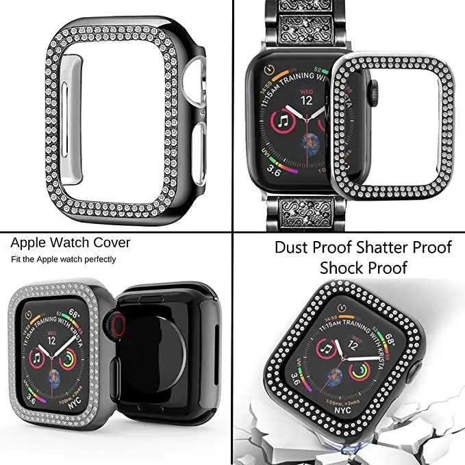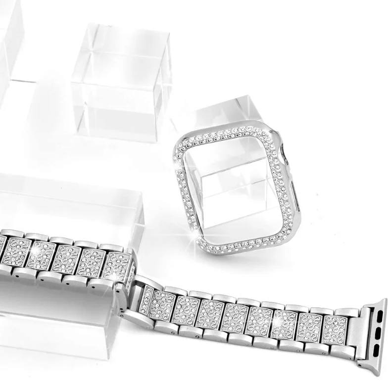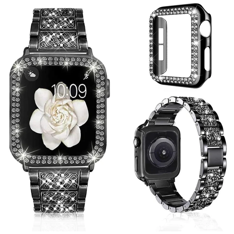 Для Apple Watch Bands 42 мм 38 мм 44 мм 40 мм, Женский Блестящий металлический ремешок + шикарный защитный чехол со стразами для iWatch Series 6 5 4 3 2 SE