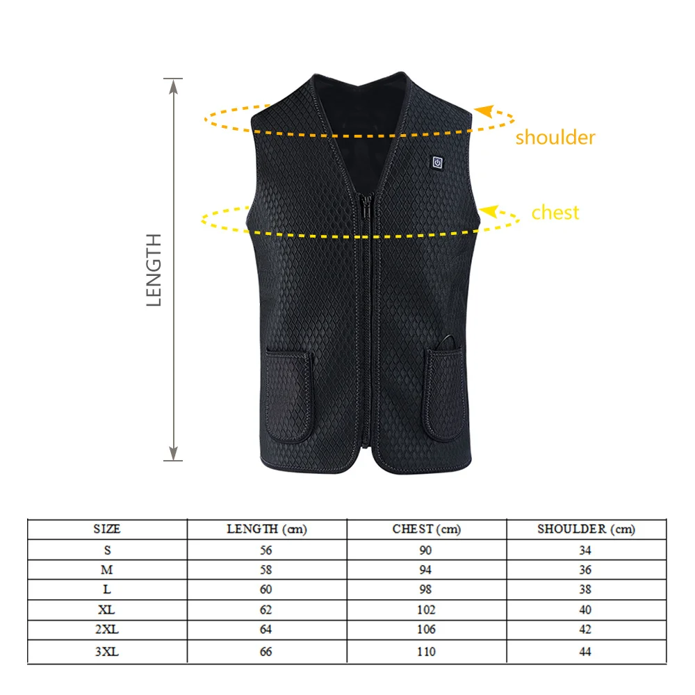 Нагревательный жилет с 3 режимами нагрева обеспечивает тепло и комфорт в холодную зиму, подходит для холодного дня и активного отдыха.Особенности:3 скорости нагрева температуры оседает 45 ℃/55 ℃/65 ℃, удобно работать.Его можно мыть и складывать, легко и удобно разбирать систему отопления.Дизайн usb-порта для зарядки 5 В подходит для большинства портативных зарядных устройств.Приятный для кожи и дышащий материал обеспечивает гладкость и удобство при ношении.Гладкая застежка-молния обеспечивает вам всестороннее тепло и удобство в носке.Нагревательный слой с нагревательными элементами обеспечивает тепло спины, шеи и живота.Сохраняет тепло в холодное время суток, потребляет избыток тепла, повышает содержание кислорода в крови и текучесть.Инфракрасные Нагревательные материалы способствуют микроциркуляции крови, отлично подходят для облегчения боли в мышцах.Характеристики:Размер: S, M, L, XL, 2XL, 3XL(Опционально) MOODEL носил XL в видеоЦвет: черныйМатериал: хлопокПосылка Вес: 600 г/1.21lbРазмер посылка: 350*260*40 мм/13,78*10,24*1,57 дюймаПримечания: