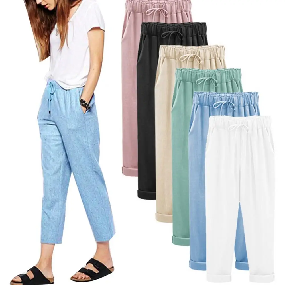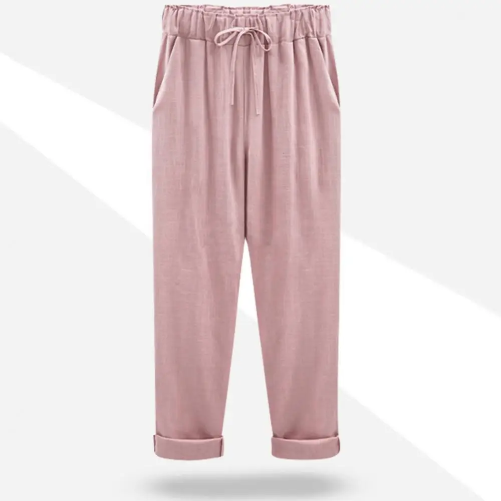 Осенние Женские однотонные брюки с эластичным поясом, хлопковые льняные укороченные брюки, свободные женские шаровары с кулиской, модные брюки