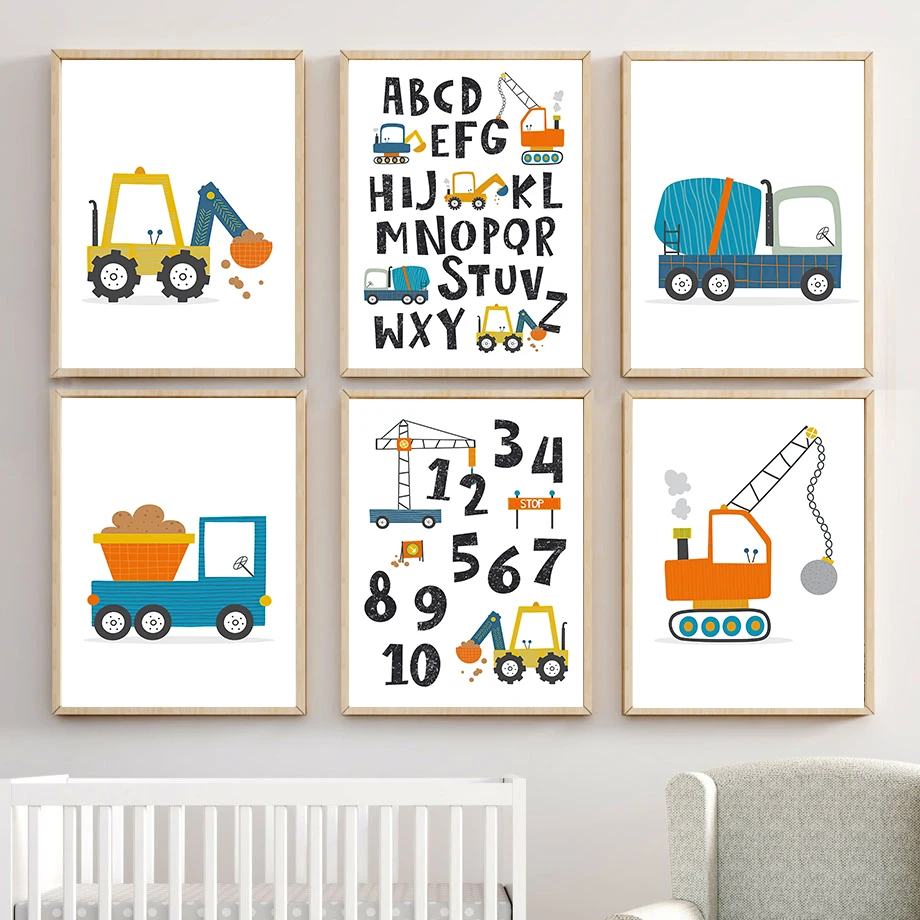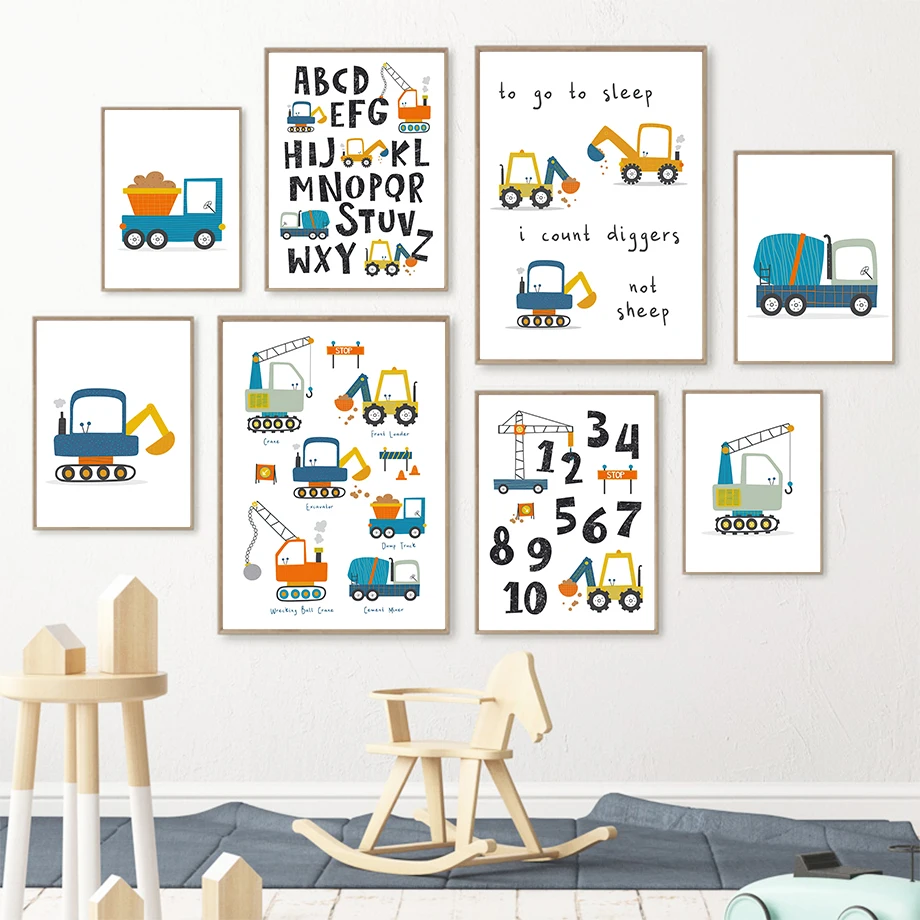 Мультяшный кран экскаватор самосвал фронтальный погрузчик настенная Картина на холсте скандинавские плакаты и принты настенные картины декор детской комнаты