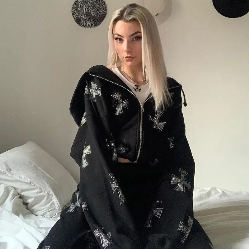 Толстовка Стразы в стиле хип-хоп Y2k толстовки на молнии с длинным ...