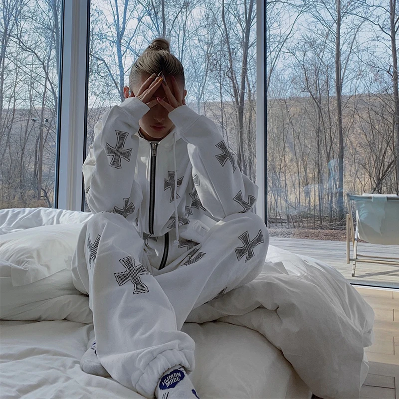 Y2k Harajuku Cross Стразы прямые широкие брюки костюм женские амери...