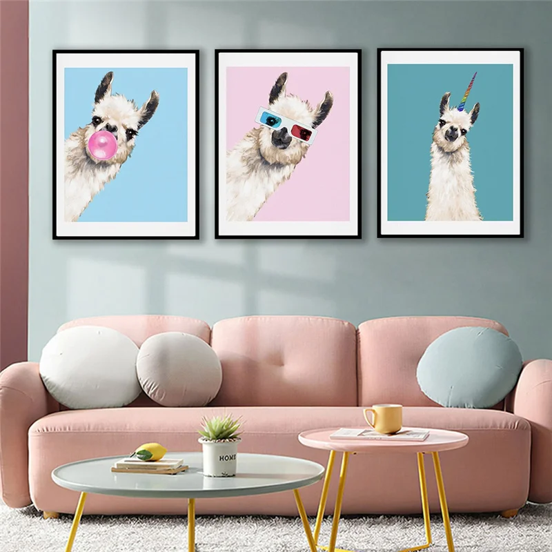 Забавная Картина на холсте с изображением пузырьков и ламы, животные, настенные художественные плакаты, розовые, синие, цветные, для детей, современные, для детской комнаты, домашний декор
