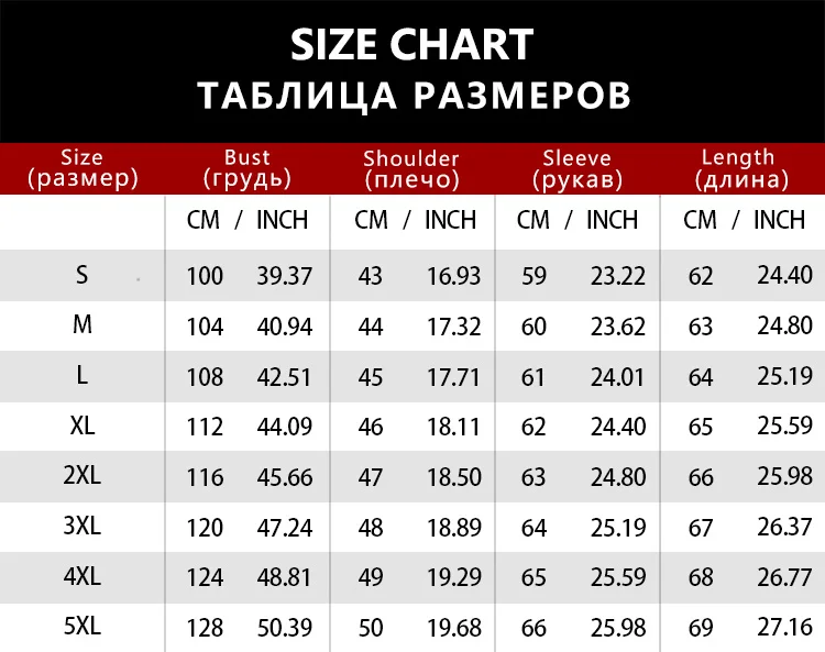 • Пожалуйста, строго следуйте таблице размеров, чтобы выбрать размер. Не выбирайте напрямую в соответствии с вашими привычками.• Изделие измеряется вручную, оно может отличаться на 2-4 см.• Эта куртка в азиатских размеров, Азиатские размеры меньше примерно на 2 размера, чем евро/американских размеров.• Все вышеуказанные измерения являются фактическими измерениями одежды. Для хорошей посадки, пожалуйста, при выборе размера из таблицы выше, добавьте 8 см ~ 10 см к груди вашего тела.• Пожалуйста, отметьте свой рост и вес, чтобы проверить свой размер при размещении заказа.