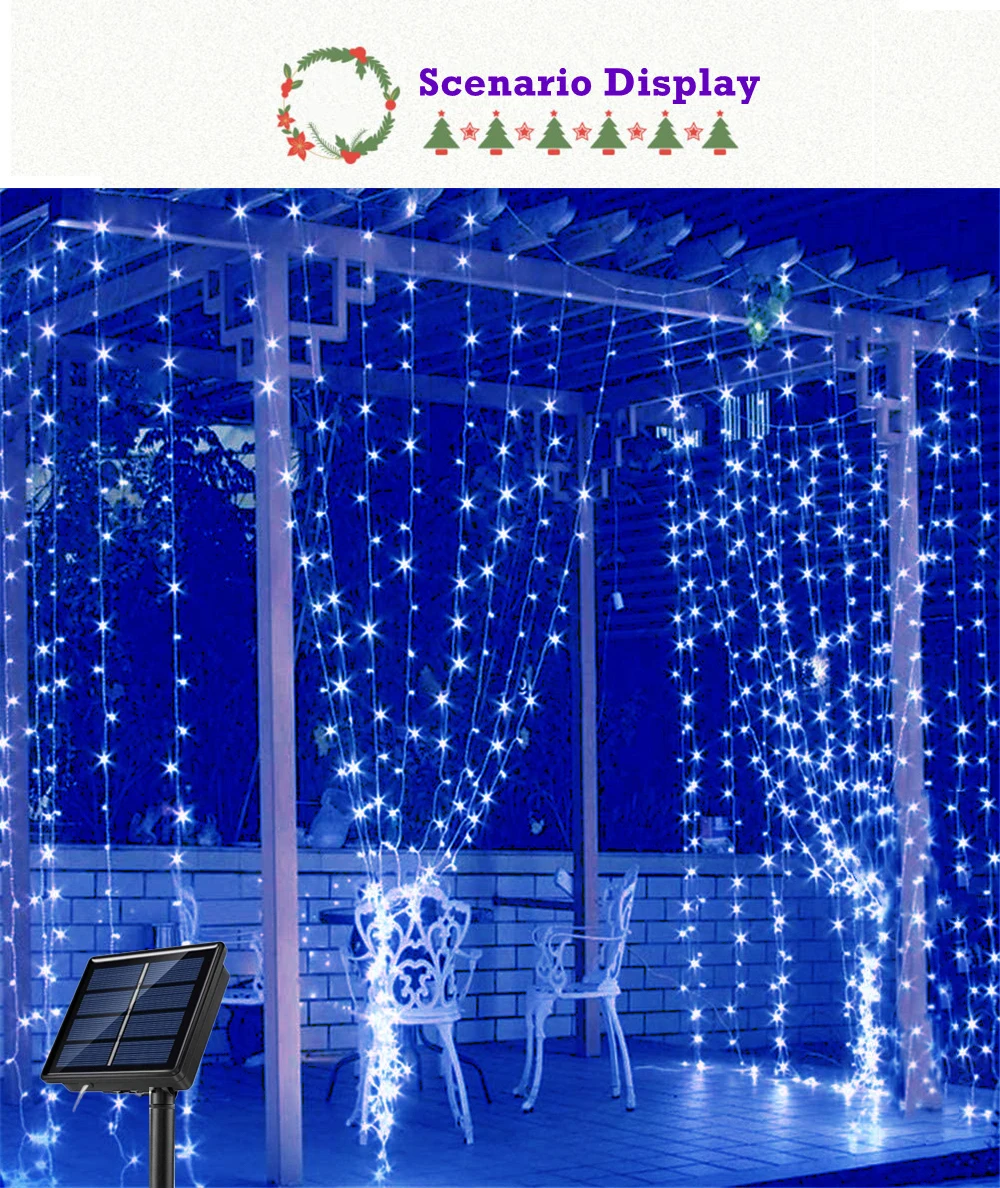● Название бренда: LANFU-STORE01.● Наименование товара: гирлянды на солнечной энергии, светодиодные гирлянды.● Технические параметры:3 м X 1 м 100 светодиодов;3 м X 2 м 200 светодиодов;3 м X 3 м 300 светодиодов.● Функция: 8 режимов работы светодиодный.● Материал: медная проволока + светодиодный светильник.● Водонепроницаемость: IP65.● Светодиодный цвет: синий/белый/многоцветный/теплый белый/зеленый/красный/фиолетовый/розовый/другой цвет, длина может быть настроена.● Источник питания: солнечная энергия.● Солнечная панель: 2 в 800 мАч.● Тип солнечных батарей: монокристаллический кремний.● Сертификация: CE & RoHS.● Продолжительность жизни: 50000 часов.