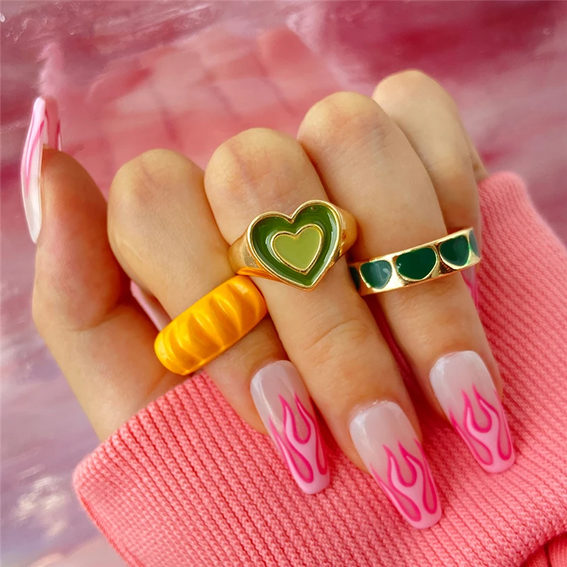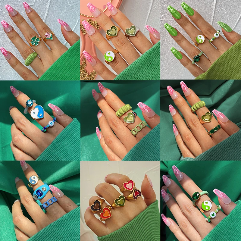 Комплект женских колец в виде сердца из смолы, с зелеными кристаллами