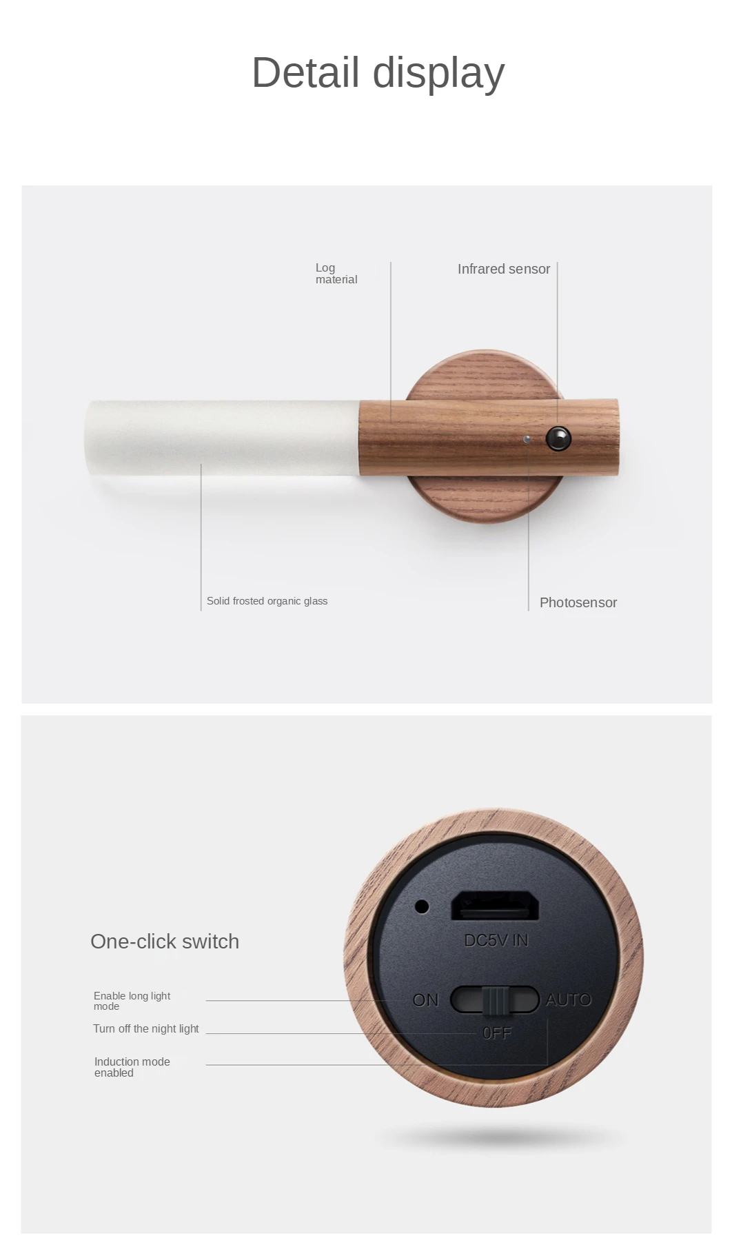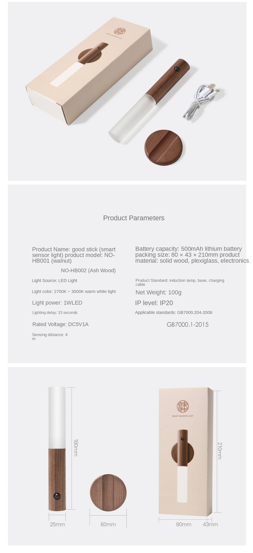 Параметры продуктаМодель изделия: NO-HB001 (грецкий орех) NO-HB002 (пепельная древесина)Материал изделия: древесина золы/орех + оргстекло + электронные компонентыСтандартная конфигурация продукта: host× 1 + base× 1 + USB line× 1 + руководство пользователя на английском языке × 1Светильник источник света: светодиодный светильникСветильник Мощность: 1 ВтСветильник Цвет: 2700K-3000K теплый белый светильникЗадержка освещения: 15 с (индукционный режим)Номинальное напряжение: DC5V 1AДиапазон срабатывания: 5-7 м спереди, 2-3 м в горизонтальном направлении и в пределах 120 ° в горизонтальном направлении.Светильник ing режим: Постоянный светильник режим + индукционный режимИндикация зарядки: зарядка, красный светильник всегда включен/полностью заряжен, светильник выключенВ режиме постоянного светильник: более 8 часовЕмкость аккумулятора: 500 мАч литиевая батареяIP Рейтинг: IP20Исполнительный стандарт: GB7000.204-2008/GB7000.1-2015Характеристики продуктаРазмер изделия: 25 × 25 × 180 мм Ночной светильник/60 × 60 мм основаниеРазмер упаковки: 80 × 43 × 210 мм (нейтральная английская цветная коробка)Вес изделия: 100 г (вес нетто)Спецификация упаковкиКоличество упаковки: 60 шт.Размер внешней коробки: 44 × 44 × 27 смFCL Вес: 14 кг (вес брутто)Инструкции по использованию1. В индукционный режим, в тех случаях, когда ночной Светильник чувства в светильник источник, функция обнаружения человеческого тела будет выключен, и ночной светильник не будет зафиксировано какое-либо движение.2. При обнаружении активности человека в темной среде светильник автоматически включается в течение 15 секунд, а затем автоматически выключается.