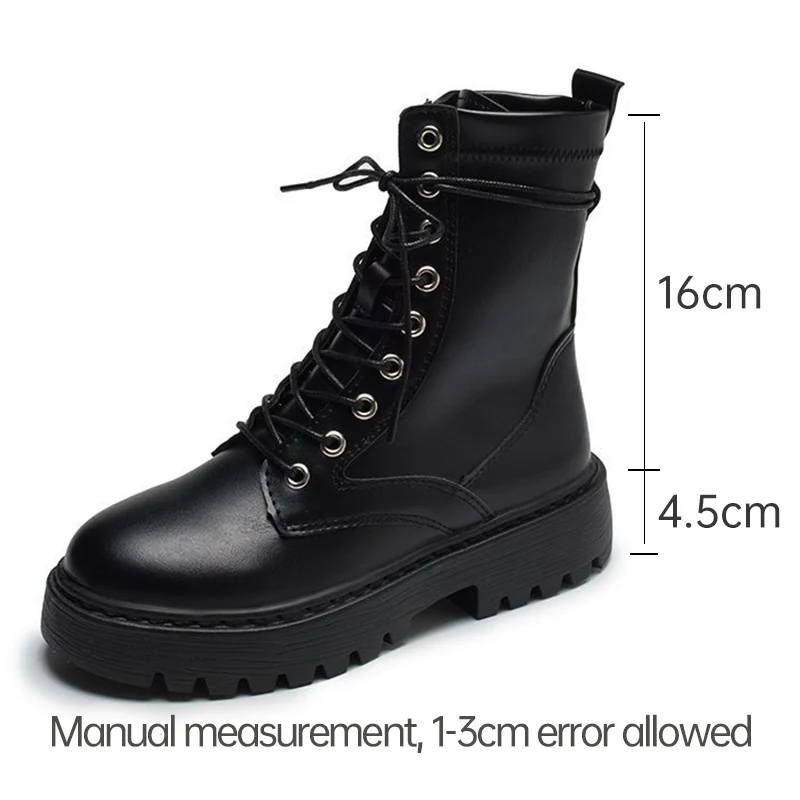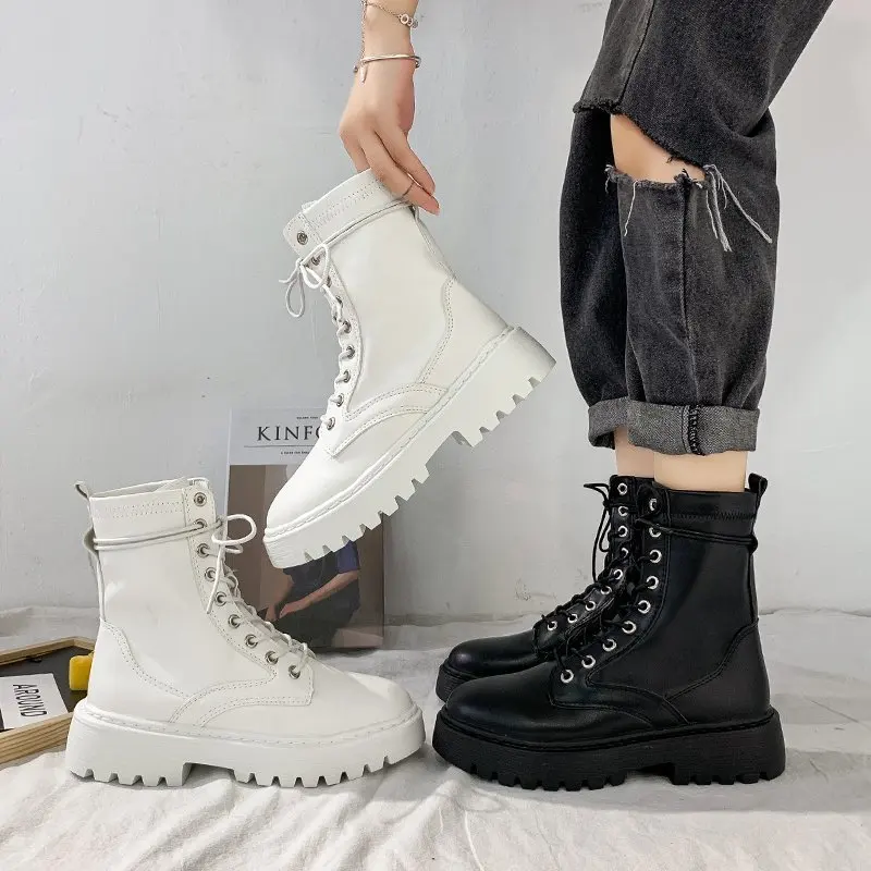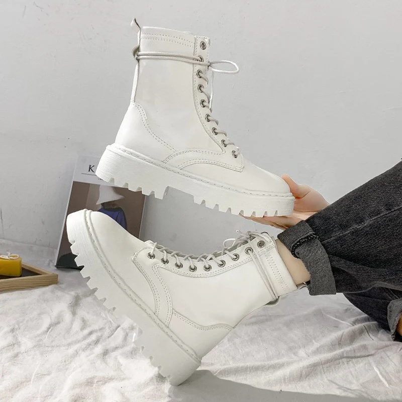 Белые женские ботинки; Ботинки Martin на платформе; Ботильоны из искусственной кожи; Сезон осень-зима; Черная Женская обувь на шнуровке с круглым носком; 2021