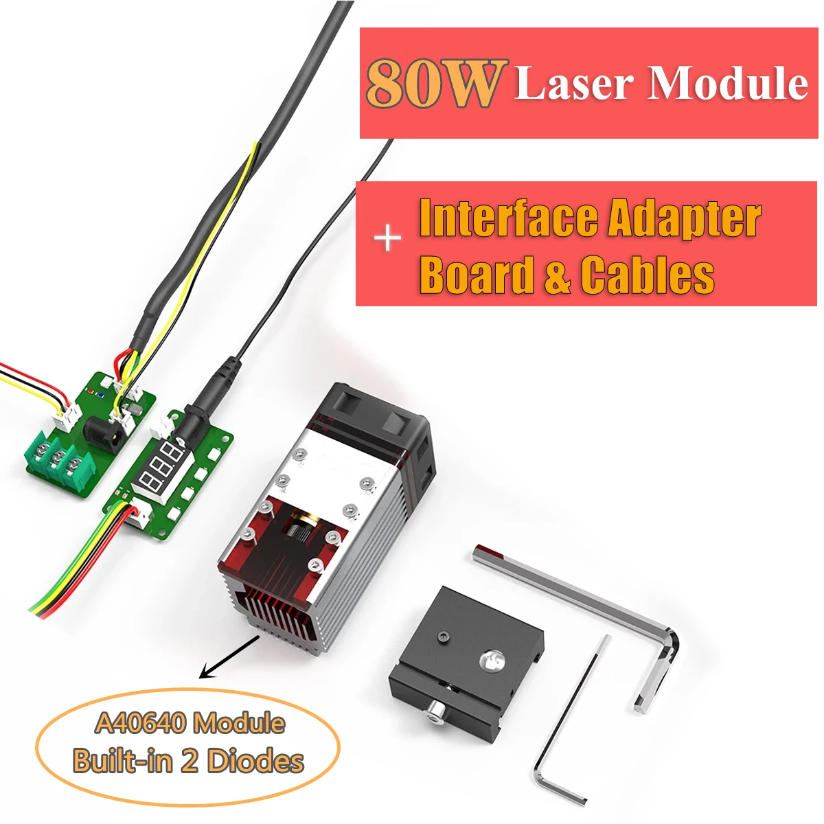 Модель: NEJE Module 80W(A40640)Материал радиатора: авиационный алюминий + латунный корпусСветящийся цвет: синийРазмер сечения: 40 мм x 40 ммРежим охлаждения: Интеллектуальный контроль датчика температуры + вентилятор охлаждения 10000 об/мин 40 ммРазмер: 60*40*40 ммРазъем адаптера: 5,5 2,1 порт