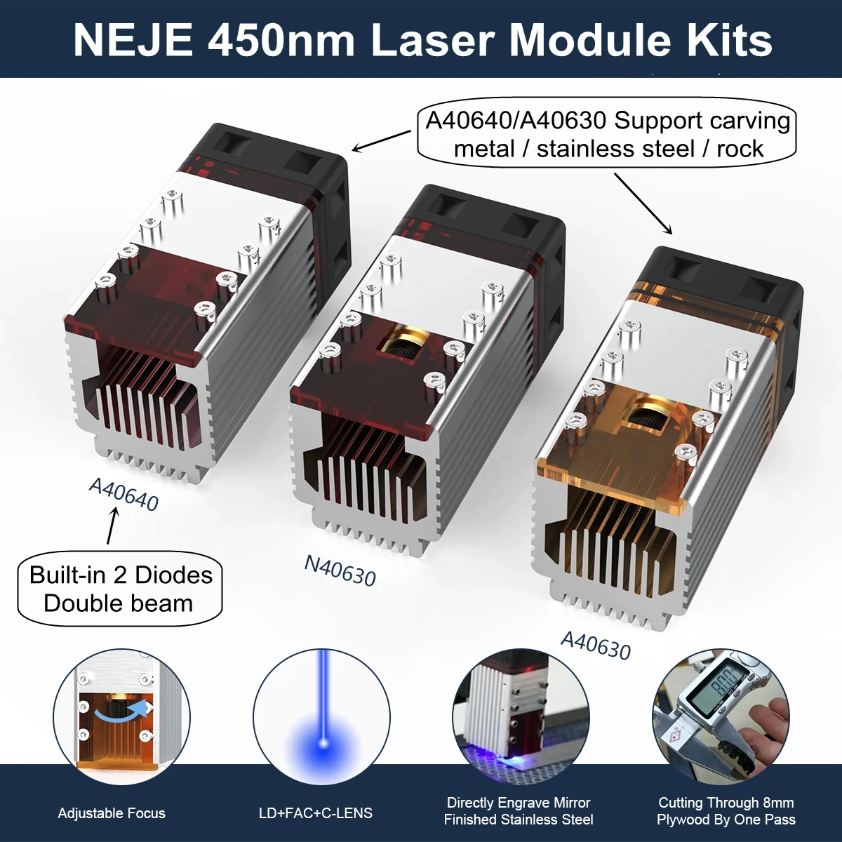 【 Как стимулировать elegir ООН модуль? 】Corte: si solo esta cortando aplicaciones dentro de 8 мм, NEJE recomienda que N30820 20W y N40630 30W sean una buena opción. Estos dos módulos pueden cortar madera contrachapada de 3-4 мм en modo de asistencia aérea. Si desea cortar 8-20 мм, puede elegir el módulo A40630, A30100 y a40640. Si hay un requisito para cortar la velocidad, se recomienda el módulo A40640 40W, F30130 es adecuado para usuarios que tienen requisitos para la eficiencia del trabajo el compresso de. Este módulo puede cortar madera contrachapada de 4 мм a la vez con un espesor mаximo de 5 мм, adopta un método de enfoque muy simple. Фокусное расстояние 5 мм puede bloquear mаs del 95% de La luz y es segura de usar. Si a menudo graba retratos, solo necesita uno de los módulos NEJE B40635 de 405 мм, este módulo es el módulo de potencia óptica móxima фактический de 405 мм, el módulo de 405 мм tiene un resultado de escala de grises muy bueno. Si usted es solo para un grabado simple, N30610 o B30635 se combinara perfecamente para usted.