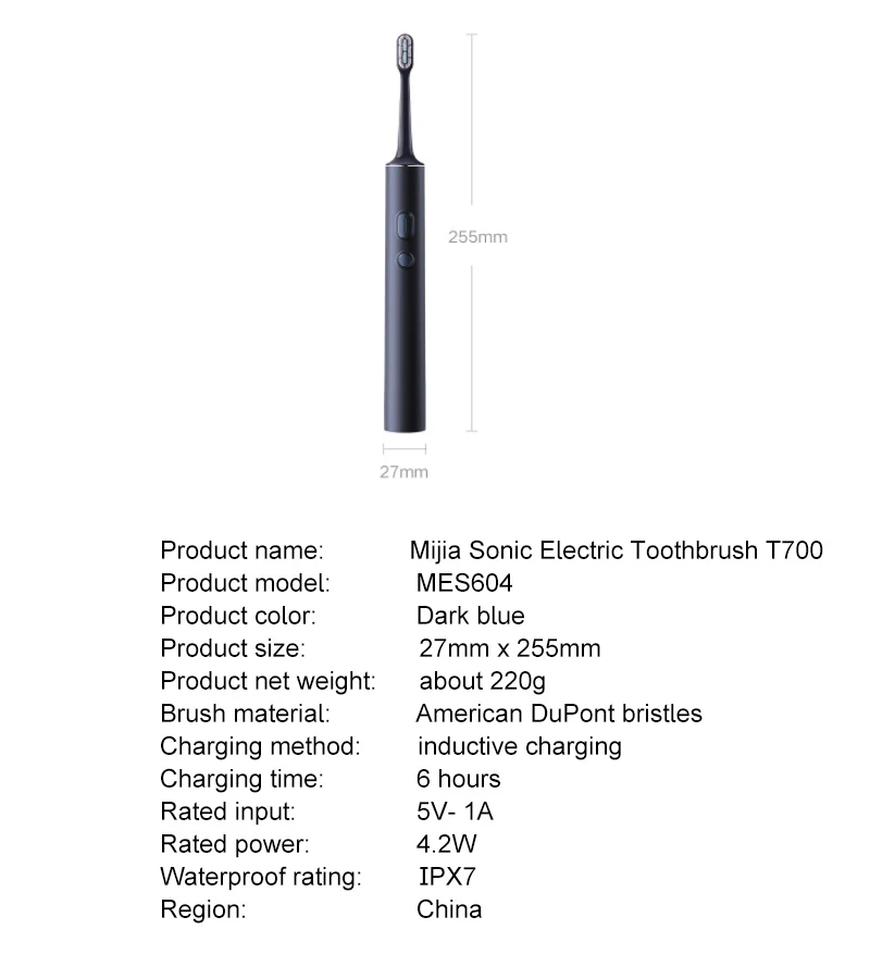 Представить:Высокое качество супер мягкие щетинки:Диаметр окружающей кисти составляет 0,127 мм, а Середина-0,152 мм; Она очень подходит для чувствительной полости рта, мягкой и деликатной, без раздражения,И может погружаться глубоко в пространство десен, чтобы очистить от зубных пятен4 мм ультра-тонкая головка кисти:По сравнению с обычными щеточными головками, они меньше и удобнее на входе, которые могут легко проникать и чистить.Углы рта.Двойное количество щетинок:Более высокая плотность обеспечивает более мощную очистку и комплексно очищает остатки пищиЗвуковой двигатель магнитной левитации:39600 раз/мин высокочастотные качели, мощные, чтобы обеспечить супер чистящую мощность. В то же время, используя амортизациюМатериал значительно уменьшает дискомфорт от рукопожатияОдна клавиша регулировки мощности:Кнопка ручки может непосредственно регулировать силу чистки, от мягкого до сильного, и несколько передач могут быть переключены по желанию, подходит дляРазличные условия полости ртаСпецификация:Название продукта: электрическая зубная щетка Mijia Sonic T700.Модель продукта: MES604Цвет: темно-синийВес нетто продукта: около 220 гМатериал щетины: американские щетинки DuPontМетод зарядки: Индуктивная зарядкаВремя зарядки: 6 часовНоминальный Вход: 5 ВНоминальная мощность: 5 ВВодонепроницаемость: IPX7Упаковочный лист:Ручка кисти x 1Защитный чехол для щетки x 2Защитный чехол для вала питания xГоловка щетки x2Зарядное устройство x 1Руководство x1