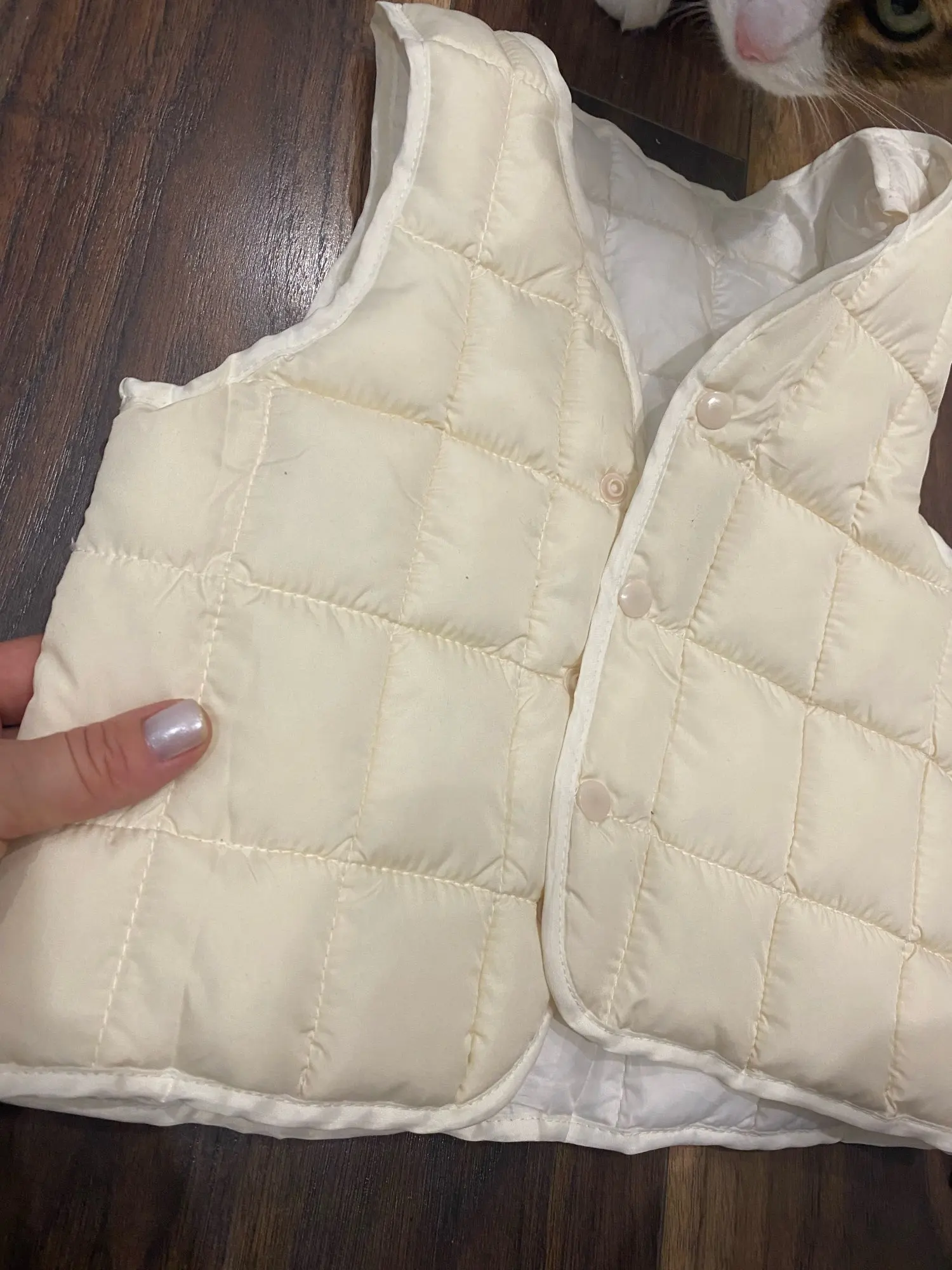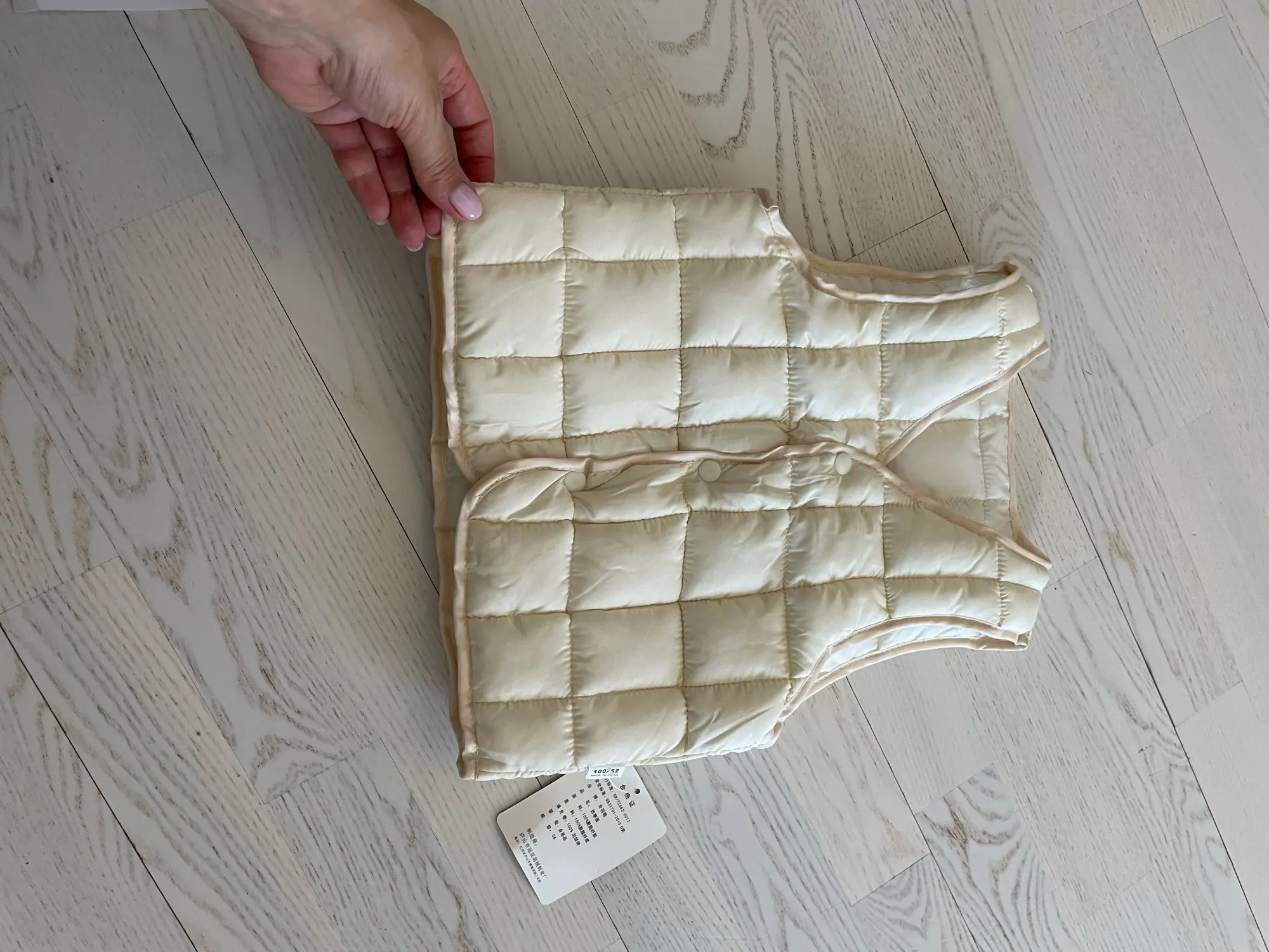 жилет хороший, строчки ровные, качественно сделан, цвет не бежевый, а скорее молочный. в описании размера самого маленького жилета написано, что рост от 80 см. Увы, на девочку, у которой рост 76см, оооочень велик. надеюсь, на следующий год будет как раз.