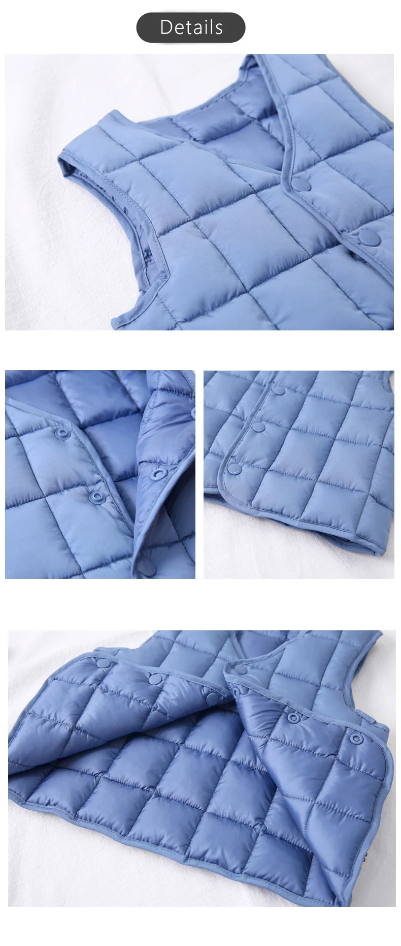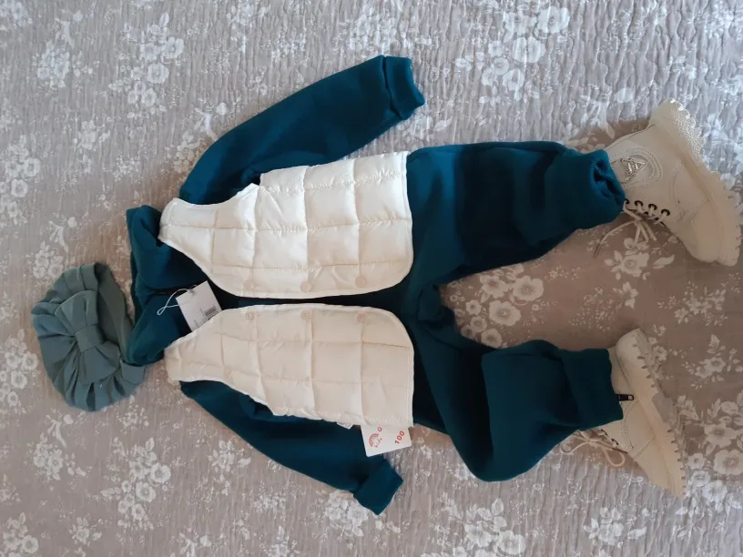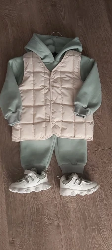 Хорошенькая жилетка. Можно носить и с изнаночной стороны(клёпки двусторонние). Пришла за две недели, обошлась в 310 рублей с бесплатной доставкой. Размер 100 на рост 83 с небольшим запасом, как раз как указано у продавца 80-90см. Есть немного торчащих ниток. Буду заказывать ещё в других цветах:)