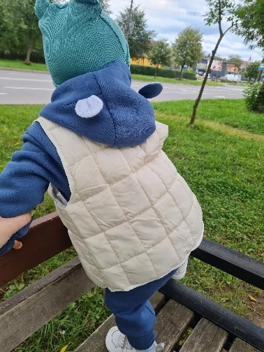 Мне очень понравилась жилетка.Тонкая,но от ветра защитит и сохранит тепло.Составила комплекты для прогулок с ней,всё нравится. Жалко расцветки очень яркие,нет бежевого цвета. На почту шла 5 недель. размер 100 на рост 80,как раз на теплый костюм.