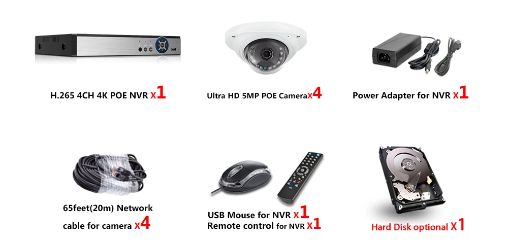 1 сетевой видеорегистратор 4CH 4K POE NVR;4 X HD POE IP 5.0MP Крытый Открытый ИК День ночного видения атмосферостойкие камеры;4X65 футов (20 м) сетевой кабель для камеры;1 X Блок питания для NVR;1 х USB мышь для NVR;1 компакт-диск программного обеспечения для NVR;1 пульт дистанционного управления для NVR;Жесткий диск опционально!