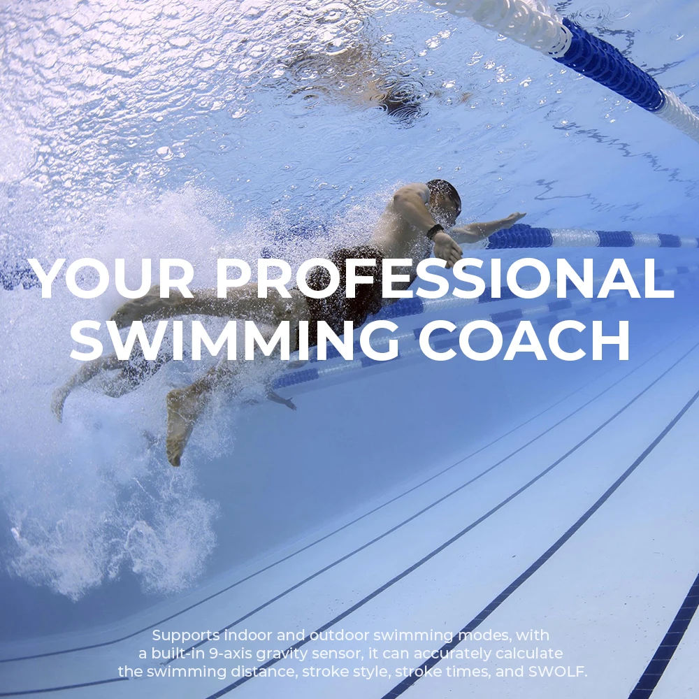 Поддерживает крытый и открытый плавательный режимов, со встроенным 9-осевой датчик поворачивания экрана, он может точно рассчитать дистанции при плавании, ход стиль, времена хода и SWOLF.