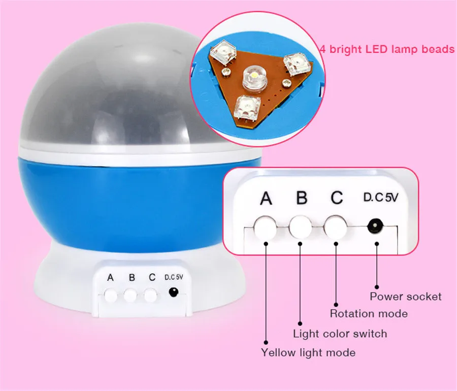Вы можете выбрать различные методы работы с питанием, USB-кабель или аккумуляторы:1. Вставьте 4 батарейки AAA в держатель батарейки с правильной полярностью, затем восстановите крышку батарейного отсека.2. 【Используйте его как лампу, вам нужно надеть крышку. Если вы хотите, чтобы это был проектор, просто снимите LID】3. Три модели:【Режим A: 】ночсветильник светильник Теплый светильник) Нажмите A снова, чтобы отключить модель.【B режим: 】 переключатель светильник вого цвета (монохромсветильник или красочное световое покрытие). Примечание: Нажмите кнопку B 9 раз подряд, Модель B отключится.【C режим: 】 это для управления поворотным переключателем (вращайте или не вращайте свободно выбранный) Примечание: Нажмите C снова, чтобы отключить вращение.Примечание: 1. Обратите внимание, что USB-кабель и аккумуляторы нельзя использовать одновременно.
