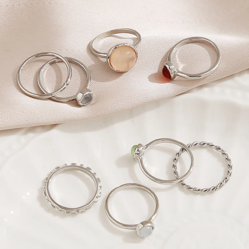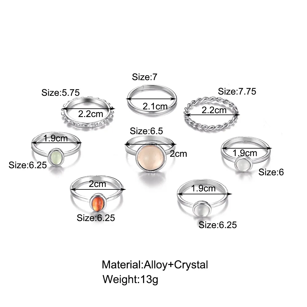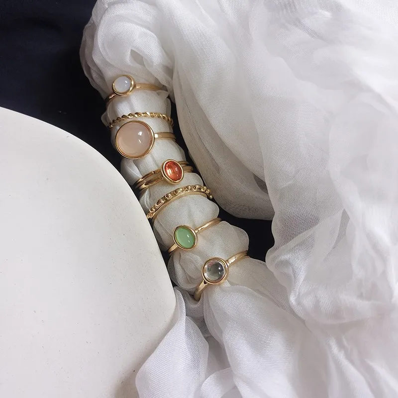 8 шт.компл. 2021 Новинка корейский винтажный красочный камень металлическая цепь модный геометрический набор популярных колец для женщин и девочек ювелирные изделия
