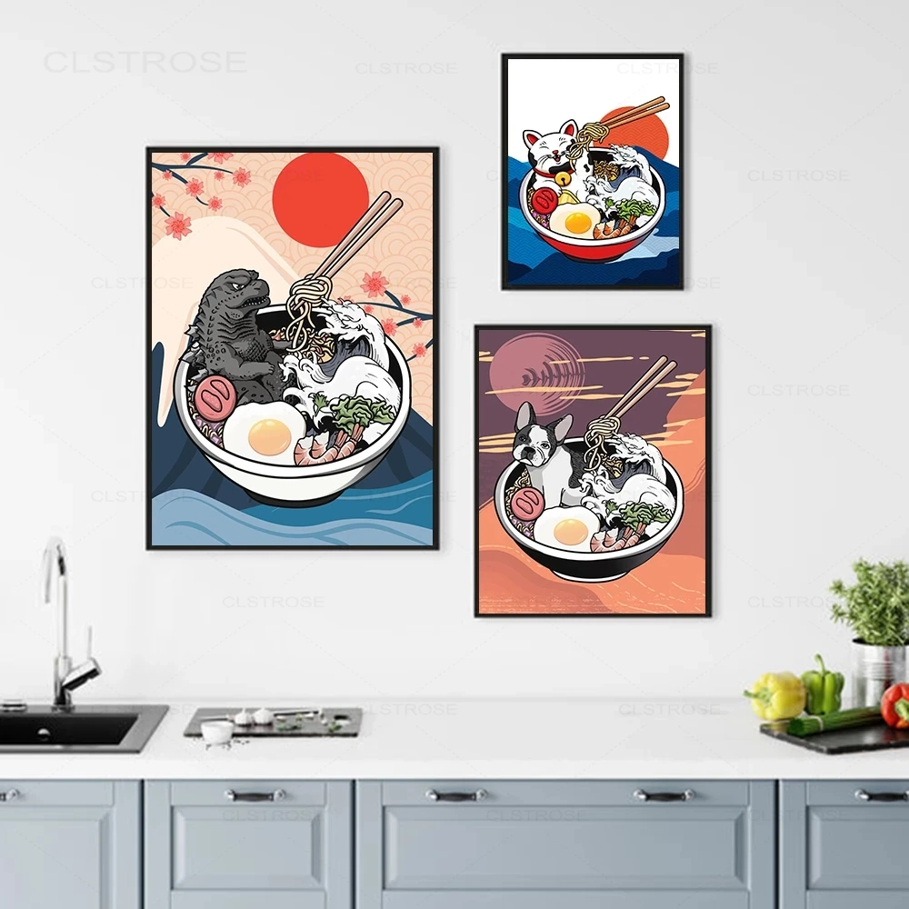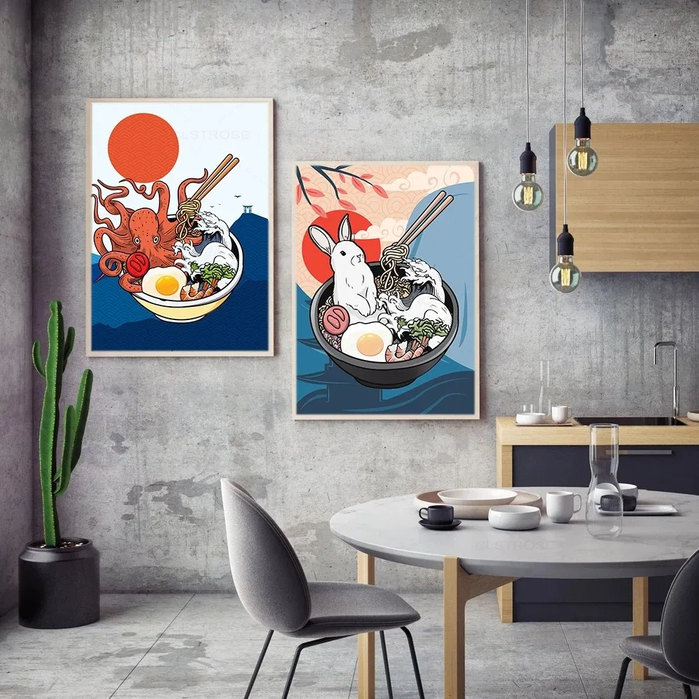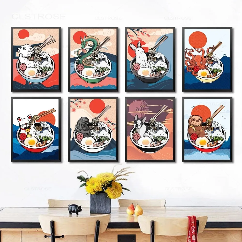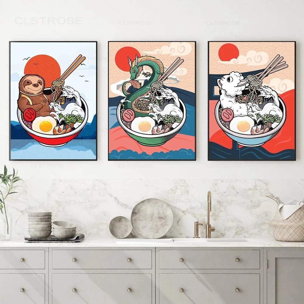 Смешные Мультяшные животные постер еды печать картина Осьминог Кот лама дракон в миске рамен холст картина для кухни декор