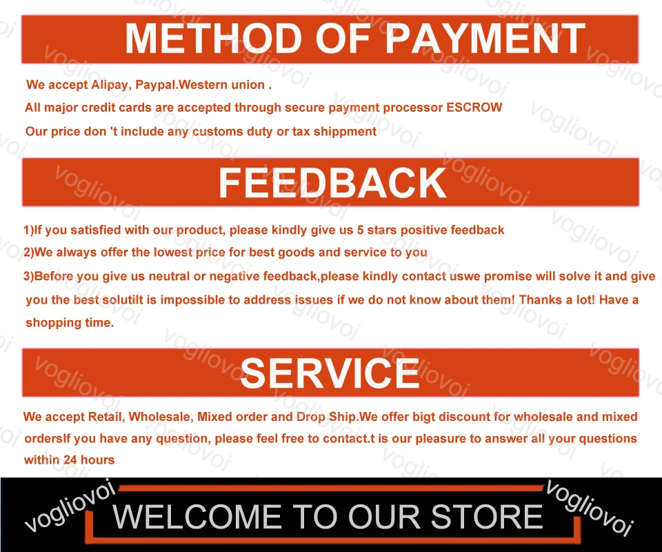 На DHgate.com доступно множество способов оплаты, таких как кредитные карты, банковские переводы в реальном времени, офлайн-платежи (банковские переводы). Вы можете выбрать любой самый удобный для вас способ доставки. Для защиты ваших интересов оплата будет временно задержана компанией DHgate и не будет передана нам, пока вы не получите заказ и не подтвердите, что остались им довольны.