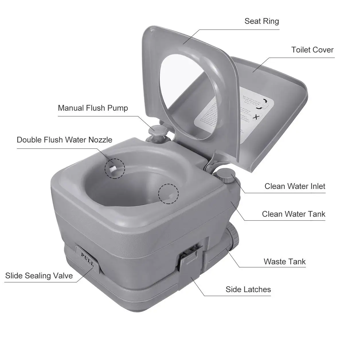 Характеристика:-Не требуется внешняя вода или силовые соединения.-Съемный резервуар для хранения чистой воды и резервуар для хранения сточных вод, без проблем заполнение чистой воды и сброс отходов.-Скользящий уплотнительный клапан блокирует запахи и защищает от утечки.-Изготовлен из полиэтиленового материала высокой плотности, устойчив к давлению и падению.-Двойная промывочная насадка.-Компактный и легкий дизайн и Интегрированные ручки для портативности.-Простота в использовании и чистке.-Подходит для прогулок на открытом воздухе, таких как кемпинг, катание на лодках и поездки. Также широко применяется для всех людей, особенно для пожилых людей, детей, беременных женщин, пациентов, людей с ограниченными возможностями и т. д.