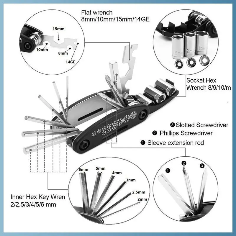 Все в одном многофункциональном инструменте, включаяВнутренний шестигранный ключ2 мм/2,5 мм/3 мм/4 мм/5 мм/6 мм,Отвертка с прорезями и Philips,Удлинитель рукава, спицевый ключ, плоский гаечный ключ8 мм/10 мм/15 мм,Торцевой ключ8 мм/9 мм/10 мм.